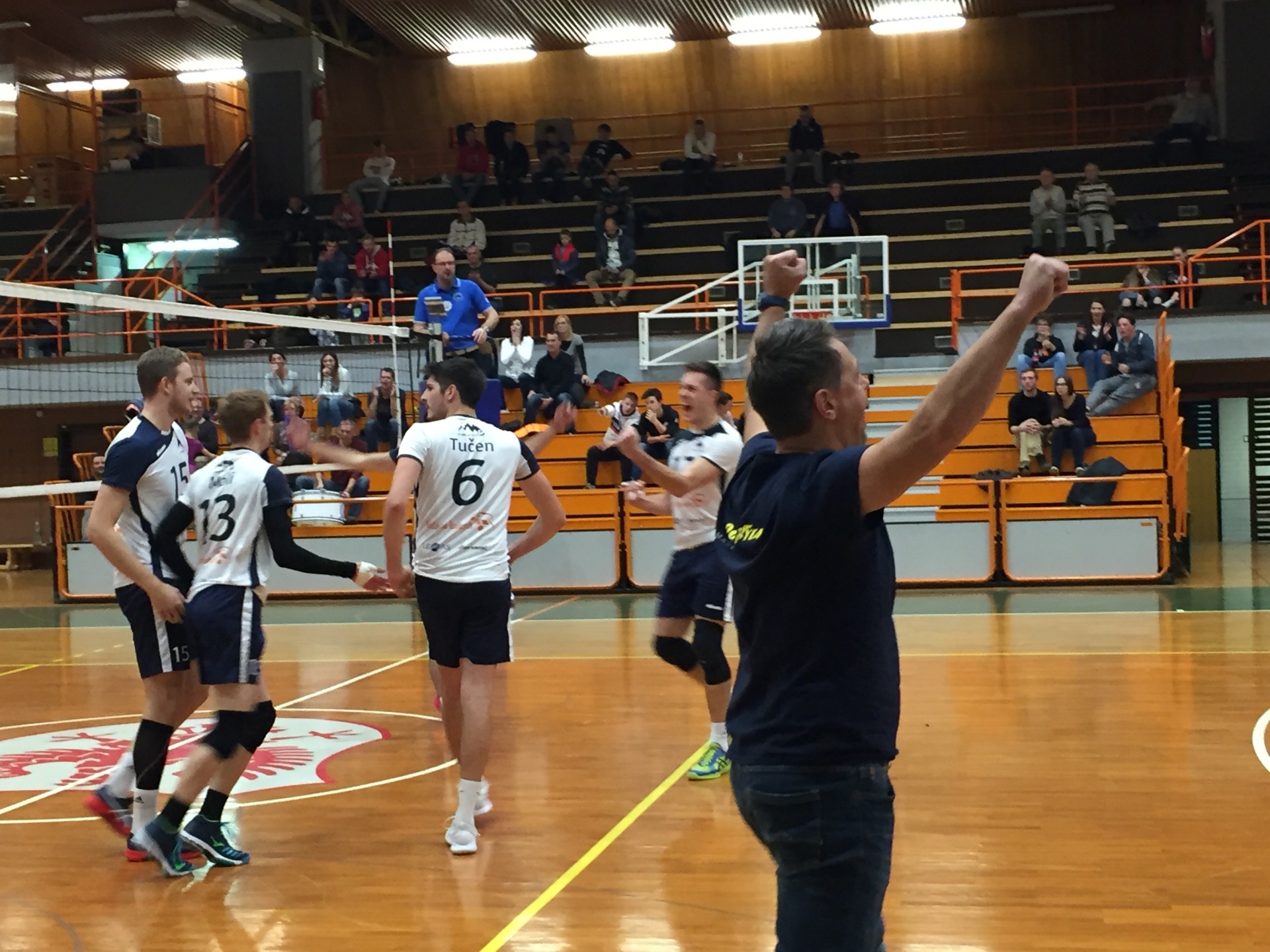 Tretji niz se je začel bolj izenačeno, saj sta točke dosegali obe ekipi. Na sredini se je izkazal Uroš Tučen, ki je nanizal nekaj lepih napadov. Kranjčani so sicer imeli pobudo, a je niso znali pretvoriti v rezultatsko prednost, dokler ni na sceno spet stopil Aleš Kök in z napadom domače povedel v prednost dveh točk. Ko je v protinapadu zaključil Bošnjak, Jenko pa dosegel točko z blokom, je bila prednost domačih že 10:6. Kako hitro se lahko stvari obrnejo v odbojki, se je izkazalo tudi tokrat. Napaka Malija v napadu in veliko sreče pri servisu Timoteja Franca 11:10 je pomenilo znižanje izida na 11:10. Time-out Ropa je dal nove energije domači šesterki, saj so v nekaj potezah spet povedli s 15:11. Tokrat sta bila eksekutorja Jenko in Mali z dvema napadoma. Miran Merkuš je vzel odmor, a Kranjčanov to ni ustavilo. Izvrstno je serviral Tučen in z dvema zaporednima asoma postavil izid 18:11, kar se je izkazalo kot nedosegljivo za goste.