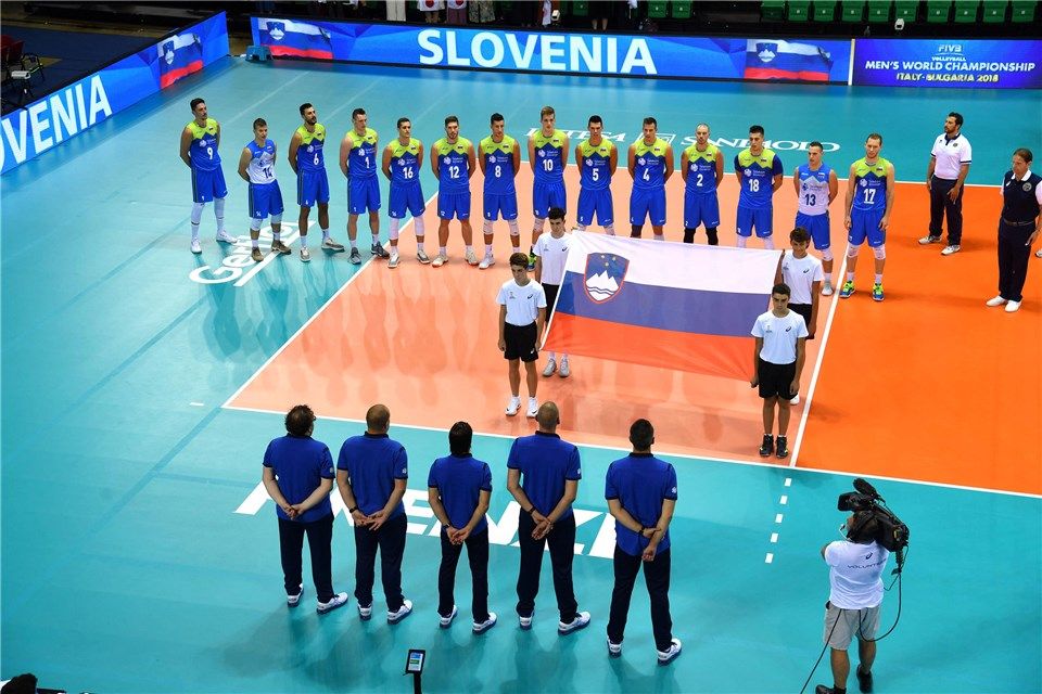 Slovenski selektor Slobodan Kovač je drugo tekmo svetovnega prvenstva začel s standardno postavo, s podajalcem Dejanom Vinčićem, korektorjem Mitjo Gasparinijem, srednjima blokerjema Janom Kozamernikom in Alenom Pajenkom, sprejemalcema Tinetom Urnautom in Klemnom Čebuljem ter prostim igralcem Janijem Kovačičem.