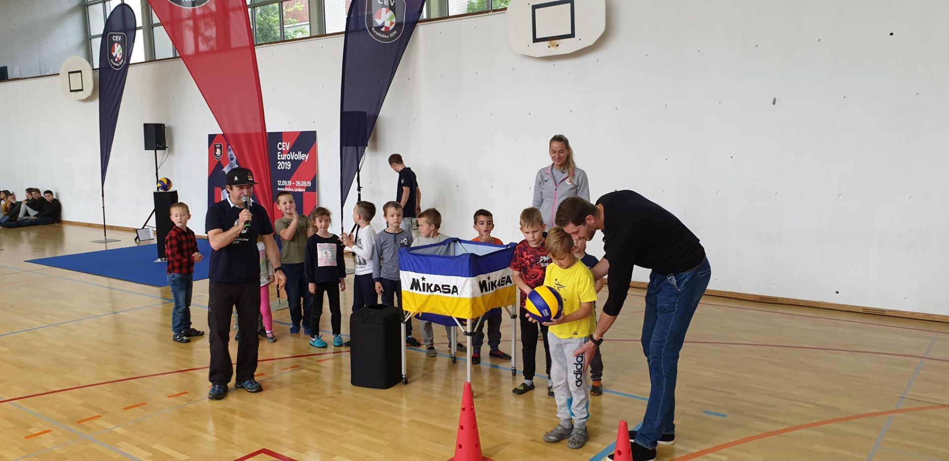 Z Miho Plotom se je prek 300 učencev OŠ Žužemberk, nad katerimi že dolga leta bdi učitelj športne vzgoje in nekdanji odbojkarski reprezentant Jugoslavije Bojan Brulec, preizkusilo v servisu in ciljanju pike, najbolj natančni so se v nagradni igri še posladkali. Tudi z Danijelom Konciljo, ki je šolarjem pokazal svojo srebrno kolajno, osvojeno leta 2015 v Bolgariji, se je gruča novomeških šolarjev preizkusila v osnovah odbojke, pri tem pa sta mu pomagala trener MOK Novo mesto Nejc Rojc in nekdanja reprezentantka ter zdaj trenerka Jana Vernig.
