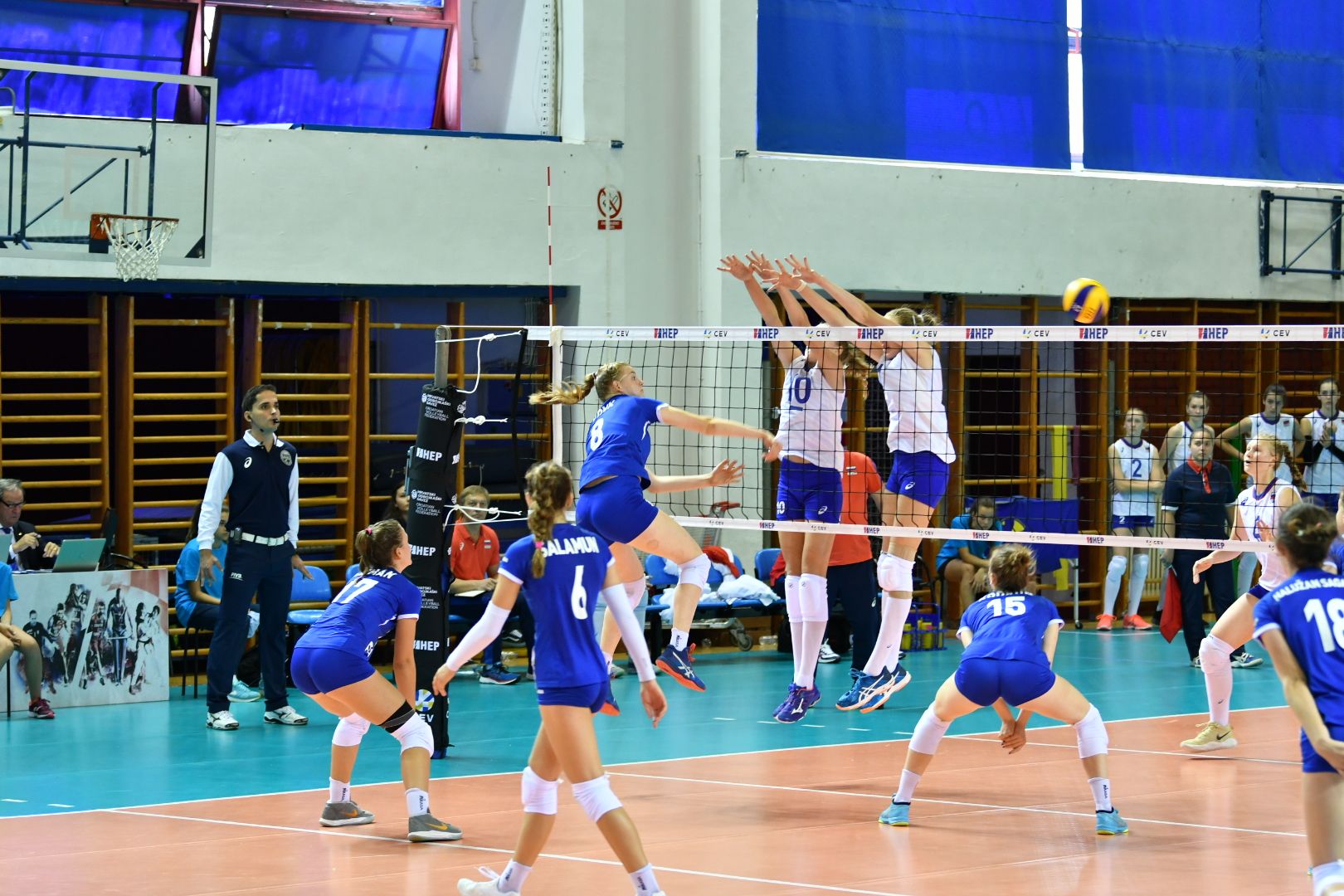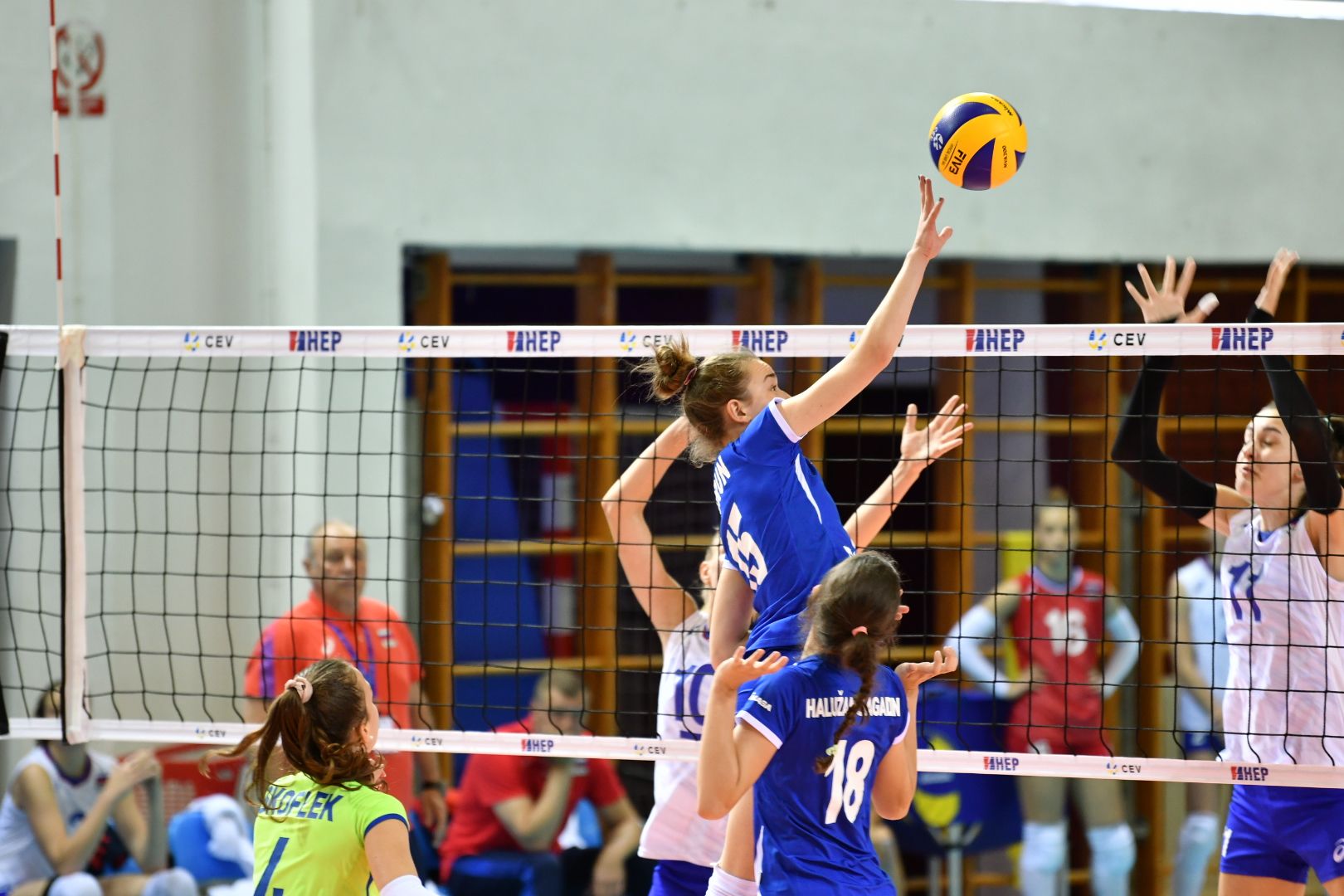 Slovenske odbojkarice v postavi Naja Šalamun, Julija Grubišič-Čabo, Žana Ivana Halužan Sagadin, Taja Gradišnik Klanjšček, Žana Godec, Neja Čižman in Urška Cikač so srečanje proti Rusiji, ki velja za eno od kandidatk za evropski naslov, začele z vodstvo s 5:2, prednost pa so zadržale tudi v nadaljevanju, zato je pri rezultatu 10:5 Alexander Karikov svoje varovanke poklical na klop. Slovenke so ostajale v ospredju do 12:7, ko je dobro servirala Halužan Sagadinova, Šalamunova pa je bila uspešna ob mreži. Nato so si naše privoščile tri zaporedne napake pri začetnih udarcih, nasprotno pa je servis uspeval tekmicam in pri 13:10 se je Živa Cof odločila za prekinitev. Slovenkam sta uspeli dve zaporedni točki za 15:10, nato pa so se znova pojavile težave pri sprejemu, tekmice so izkoristile protinapade in poravnale na 15:15. Čižmanova je z blokom in asom poskrbela za vodstvo z 19:16, naša dekleta so s tremi točkami naskoka vstopila tudi v zaključek niza (21:18). Po uspešnem varanju podajalke Halužan Sagadinove za 23:19 je ruska klop poizkusila s še enim odmorom, a je sledil as Godčeve za 24:19, Slovenke so po napaki nasprotnic slavile s 25:21.
