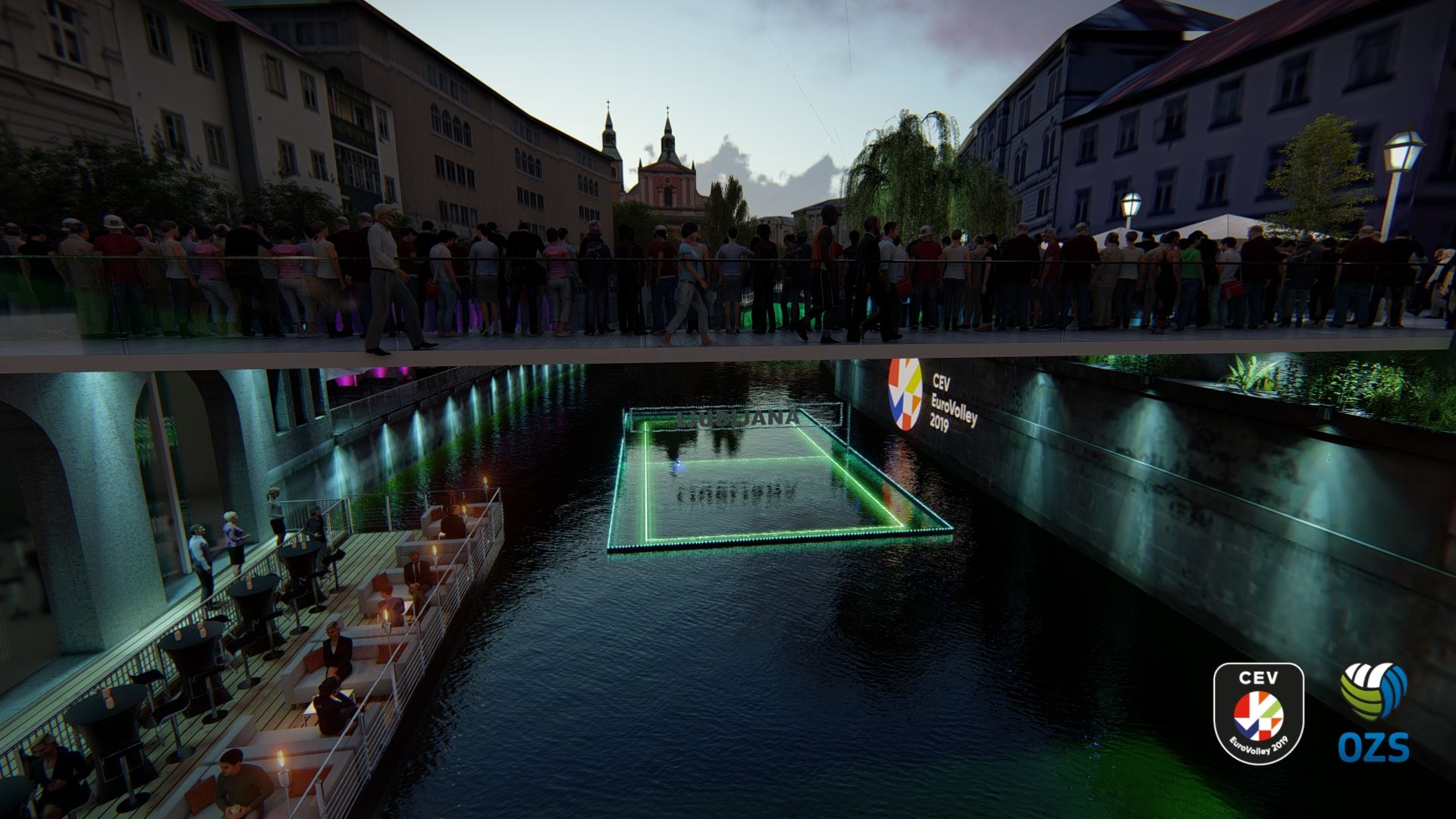 Pod Ribjo brvjo pri lokalu Makalonca v neposredni bližini Tromostovja bomo z rečnega nabrežja spremljali tekmo med svetovnimi odbojkarskimi zvezdniki, ki bo potekala na plavajočem igrišču sredi Ljubljanice. Igralna površina bo obrobljena s svetlečimi črtami, ki bodo označevale igralno polje, večerna atmosfera pa bo gledalcem dala občutek, da odbojkarje spremljajo, medtem ko se ti premikajo tik nad vodno gladino.