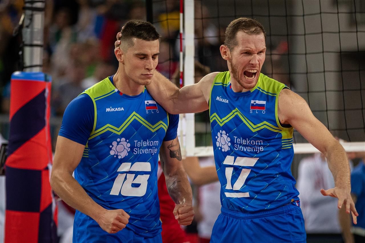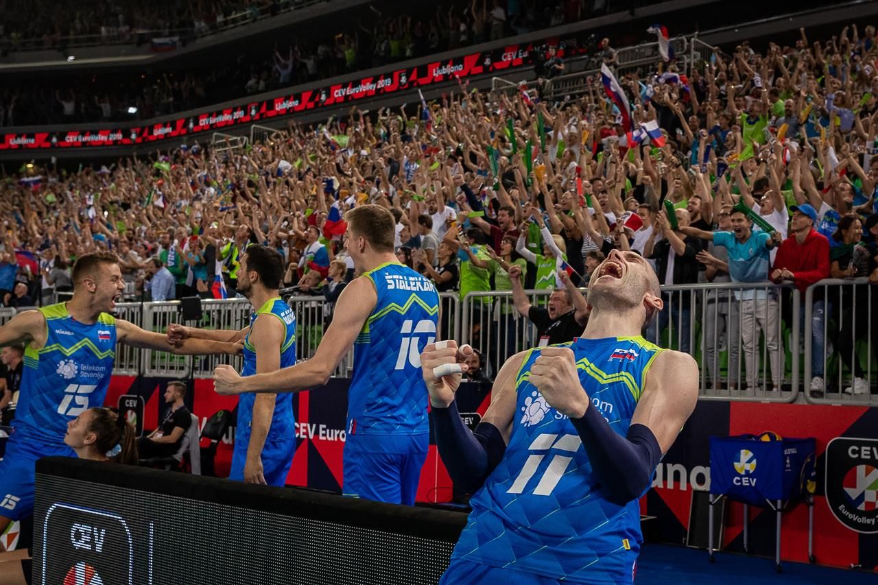 Slovenija je polfinalno srečanje proti Poljski začela v udarni postavi Dejan Vinčić, Mitja Gasparini, Alen Pajenk, Jan Kozamernik, Klemen Čebulj, kapetan Tine Urnaut in Jani Kovačič na mestu prostega igralca. Uvodni točki v Stožicah sta pripadli Poljakom, ki so tudi v nadaljevanju narekovali ritem igre. Sledilo je še nekaj napak na slovenski strani mreže in nasprotniki so povedli za štiri točke, zato je strateg naše izbrane vrste Alberto Giuliani zahteval premor. Tudi po prekinitvi so Poljaki nadaljevali z močnimi začetnimi udarci. Leon je tako dosegel naslednjo točko, nato pa je Gasparini z uspešnim napadom le prekinil poljski niz. Ob glasni podpori s tribun razprodane Arene Stožice je sledila serija dobrih začetnih udarcev Urnauta in Slovenci so se približali le na točko zaostanka, z napadom Kozamernika pa izenačili na 9. točki. Poljaki so zopet pobegnili za nekaj točk, a so naši odbojkarji ujeli priključek (17-18). Po dveh zaporednih točkah Poljske je namesto Gasparinija na igrišče stopil Tonček Štern, novo točko pa je Sloveniji z zvitim napadom prinesel Čebulj, ki je bil glavna tarča poljskih serverjev. Slovenci so tudi v končnici ostali zbrani in z blokom poravnali rezultat na 22:22. Po uspešnem napadu je Čebulj s točko neposredno z začetnim udarcem priboril domačinom prvo zaključno žogo, a so se Poljaki preko Wilfreda Leona v prvo še uspeli ubraniti, Pajenk pa je z izjemnim blokom Sloveniji priboril prvi niz.