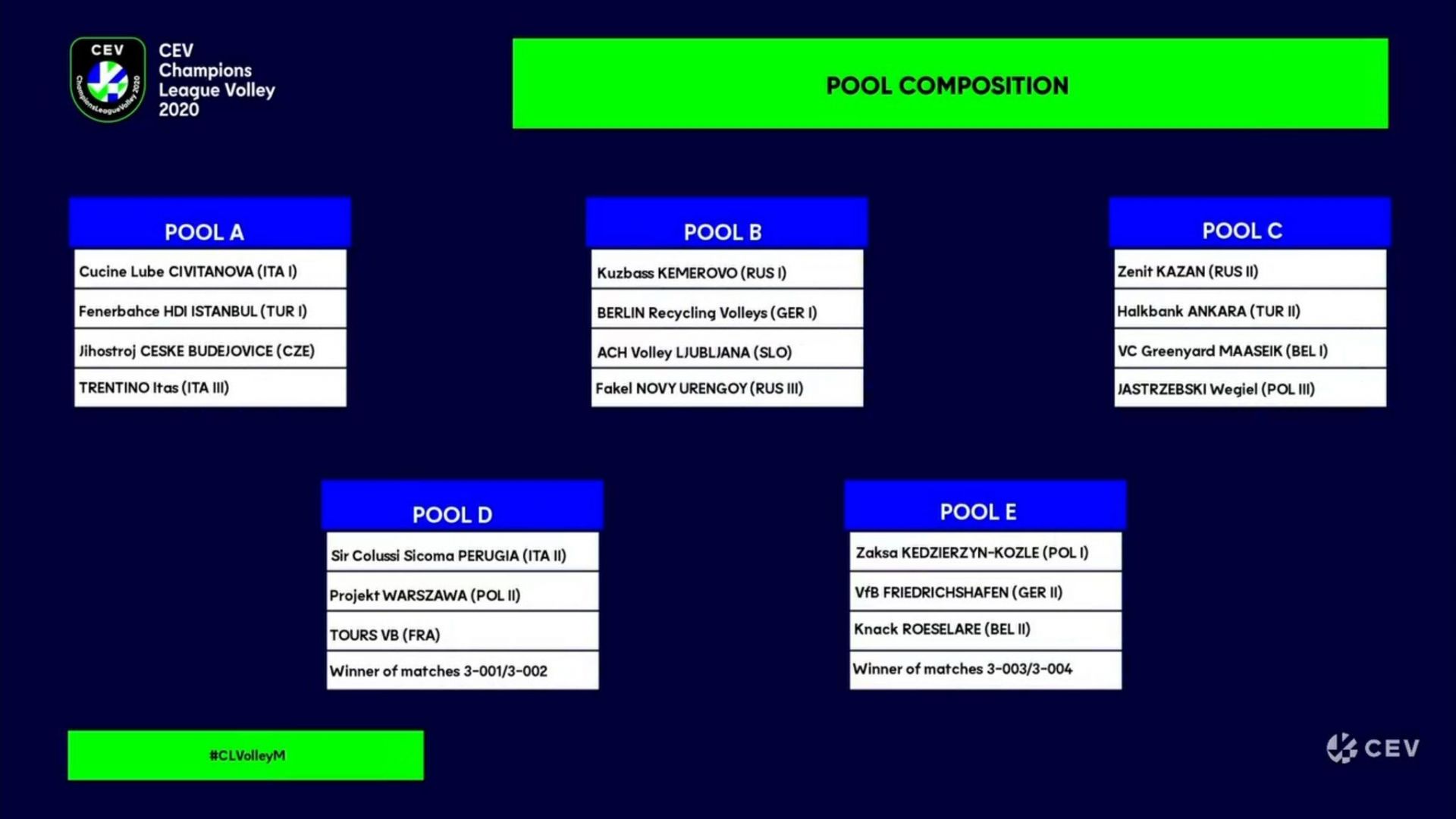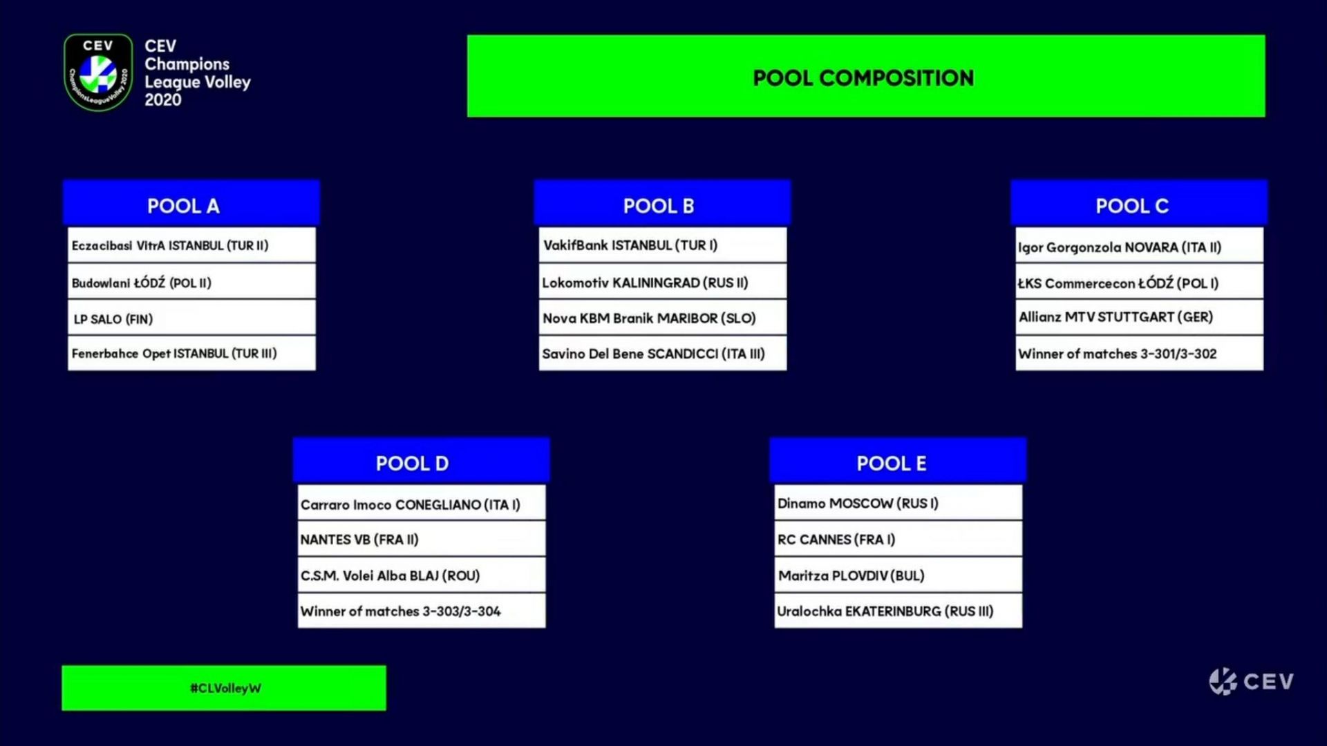 Slovenske prvakinje, odbojkarice Nove KBM Branik, bodo v elitni ligi prvakinj moči merile s turškim Vakif Bankom, ruskim Lokomotivom Kaliningrad in italijanskim moštvom Davini Del Bene Scandicci. Ljubljančani se bodo v ligi prvakov srečali z ruskima ekipama Kuzbass Kemerovo in Fakel Novy Urengoy ter nemškim Berlinom Recycling Volleys.