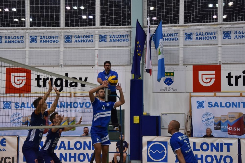 Obe ekipi sta na začetki prvega niza veliko grešili pri izvajanju začetnih udarcev. Gostje so po zaslugi razigranega Đirliča povedli 5:9. Z dvema zaporednima blokoma Karnela in Peterlina do domači znižali zaostanek na 7:10. Kanalski korektor Vrtovec je dvakrat zaporedoma blokiral ljubljanske napadalce in poskrbel za izenačenje rezultata na 12:12. Sledil je nov pobeg gostov na 12:16, ko je domači trener Šimunčić izkoristil že drugi polminutni odmor. Po dveh zaporednih asih gostujočega korektorja Đirlića je domači strateg v igro namesto Čabarkape poslal Tomiča in točko kasneje še Nanuta namesto Peterlina. Salonit Anhovo se je približal na 17:20. Prvi niz je z dvema zaporednima asoma zaključil gostujoči organizator igre Vilimanović.