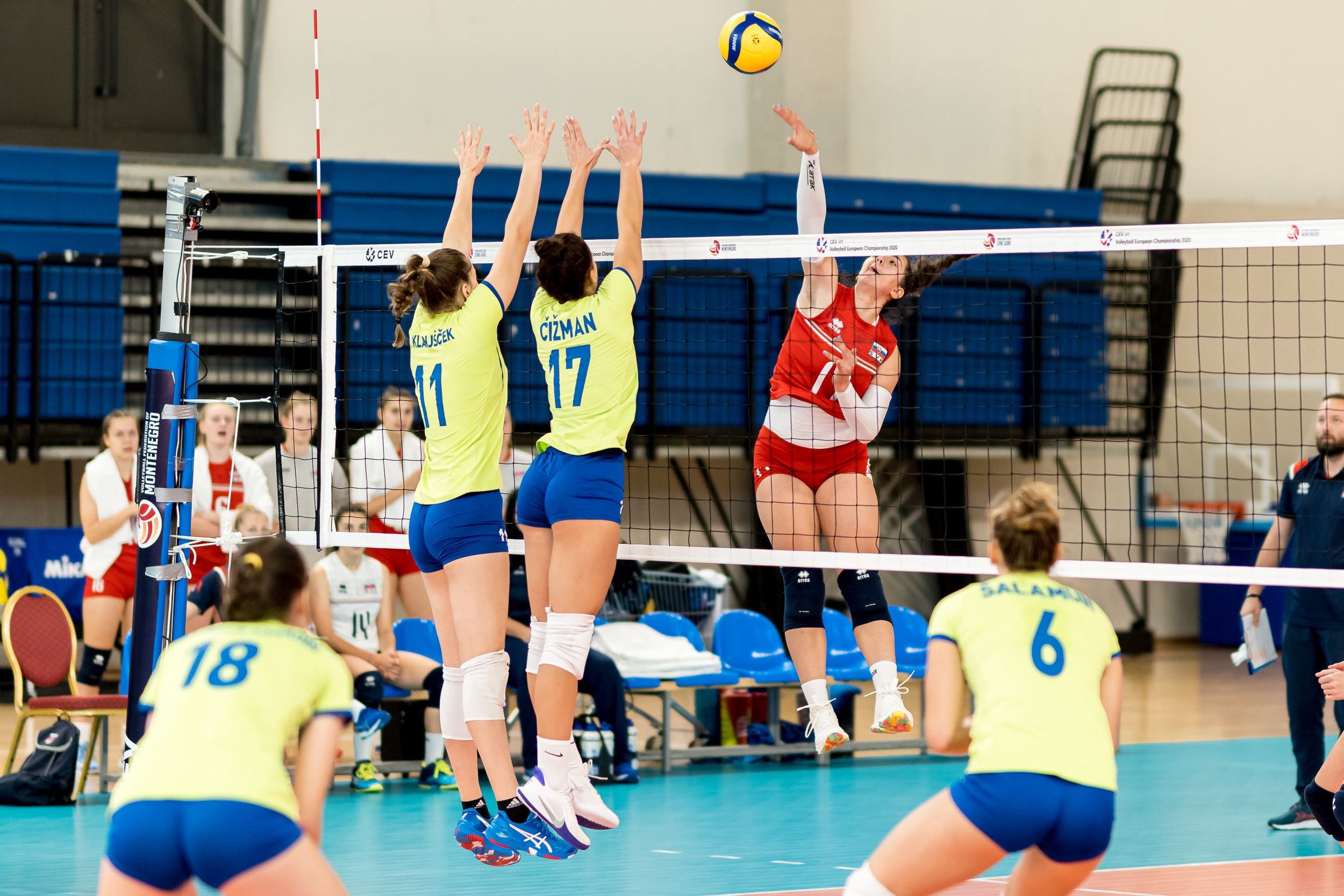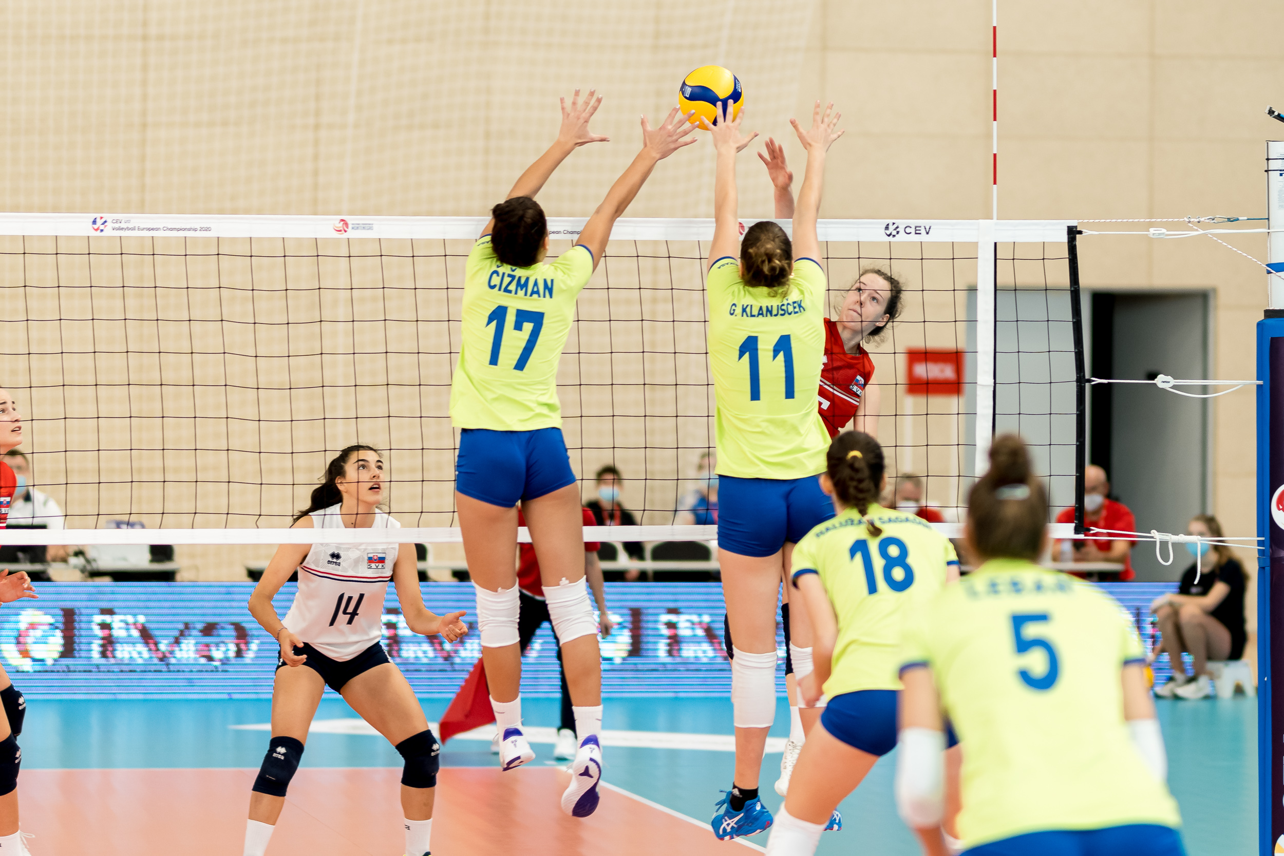 Slovenske odbojkarice so se s Slovaško na tem prvenstvu pomerile še drugič in tudi tokrat nekoliko bolje začele srečanje, saj je moral slovaški strateg Marek Malicky pri zaostanku z 1:4 poseči po prvem odmoru. Njegove varovanke so se vrnile v igro in ujele priključek na 6:7, a naša dekleta so bila v nadaljevanju bolj prepričljiva. Uspešno sta ob mreži igrali predvsem Naja Šalamun in Neja Čižman, ki je prispevala še as za 18:12, točko za 21:16 je dosegla Taja Gradišnik Klanjšček z varanjem. Varovanke Sama Miklavca so hitro prišle do prve zaključne žoge pri 24:17 in jo z blokom Žane Godec in Ise Ramić tudi izkoristile.