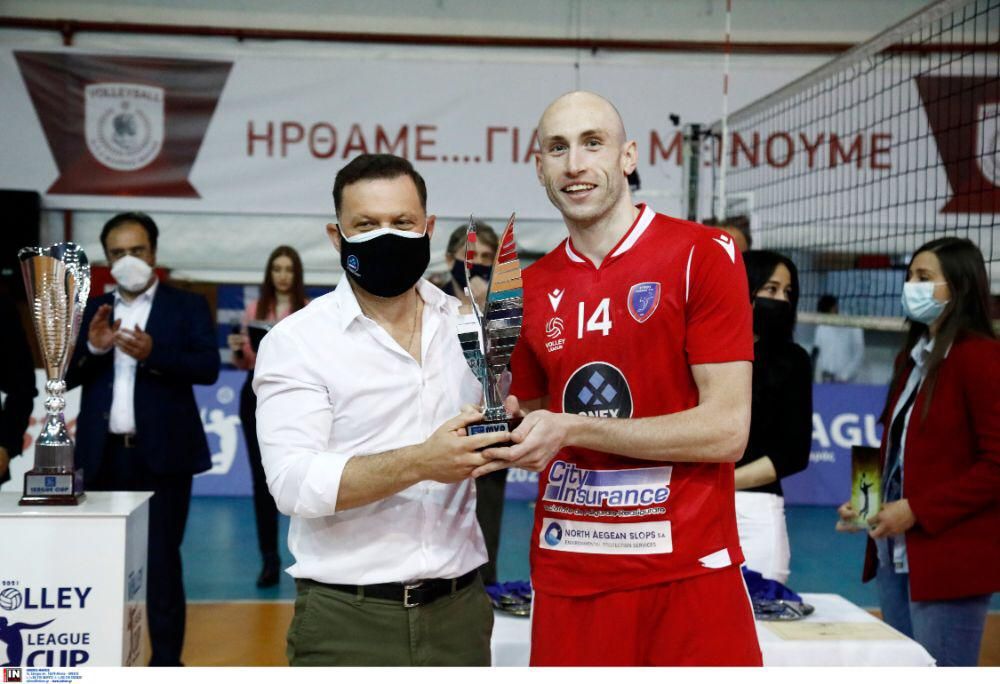 Tudi v finalu moškega pokalnega tekmovanja je naziv MVP pripadel slovenskemu reprezentantu. Podelili so ga Žigi Šternu, ki je prispeval levji delež k uspehu svoje ekipe Foinikas Sirou. Za zmago proti APS Filippos je ekipa z grškega otoka Sirosa potrebovala štiri nize, po katerih se je razveselila druge lovorike, prve po sezoni 2011/12. Naš reprezentančni sprejemalec je blestel z 22 točkami (en as in dva bloka).