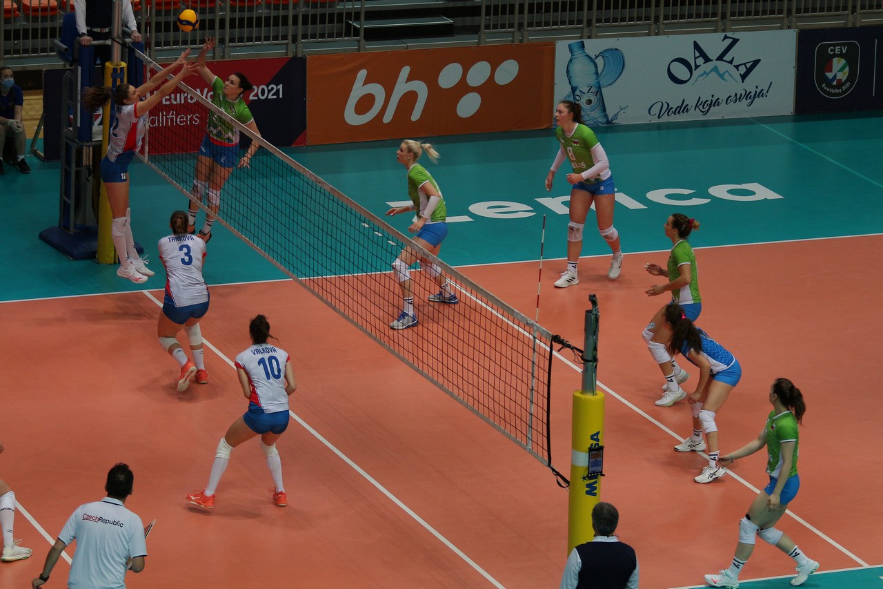 Napake slovenske vrste v zasedbi Eva Mori, Eva Zatkovič, Monika Potokar, Lorena Lorber Fijok, Tina Grudina, Saša Planinšec in Leja Janežič so Češki že v uvodu v prvi niz prinesle vodstvo s 4:0, zaradi česar je moral italijanski strateg na naši klopi Alessandro Chiappini vzeti odmor. Po njem so se njegove varovanke zbrale ter s točkami Grudine, Zatkovićeve in Lorber Fijokove izenačile na 7:7. As Morijeve je prinesel prvo vodstvo Slovenije pri 8:7, Grk Ioannis Athanasopoulos je zahteval prekinitev. Spremljali smo izenačeno nadaljevanje, ekipi sta bili pri 11:11 še poravnani, nato pa so Čehinje s protinapadi Andree Kossanyiove, Michaele Mlejnkove in Veronike Trnkove pobegnile na 15:12 in razliko še povečale na 18:13. Chiappini je poizkusil z drugim odmorom, a so tekmice ostale v ospredju in z vodstvom z 21:15 vstopile v končnico ter niz zanesljivo dobile s 25:18.