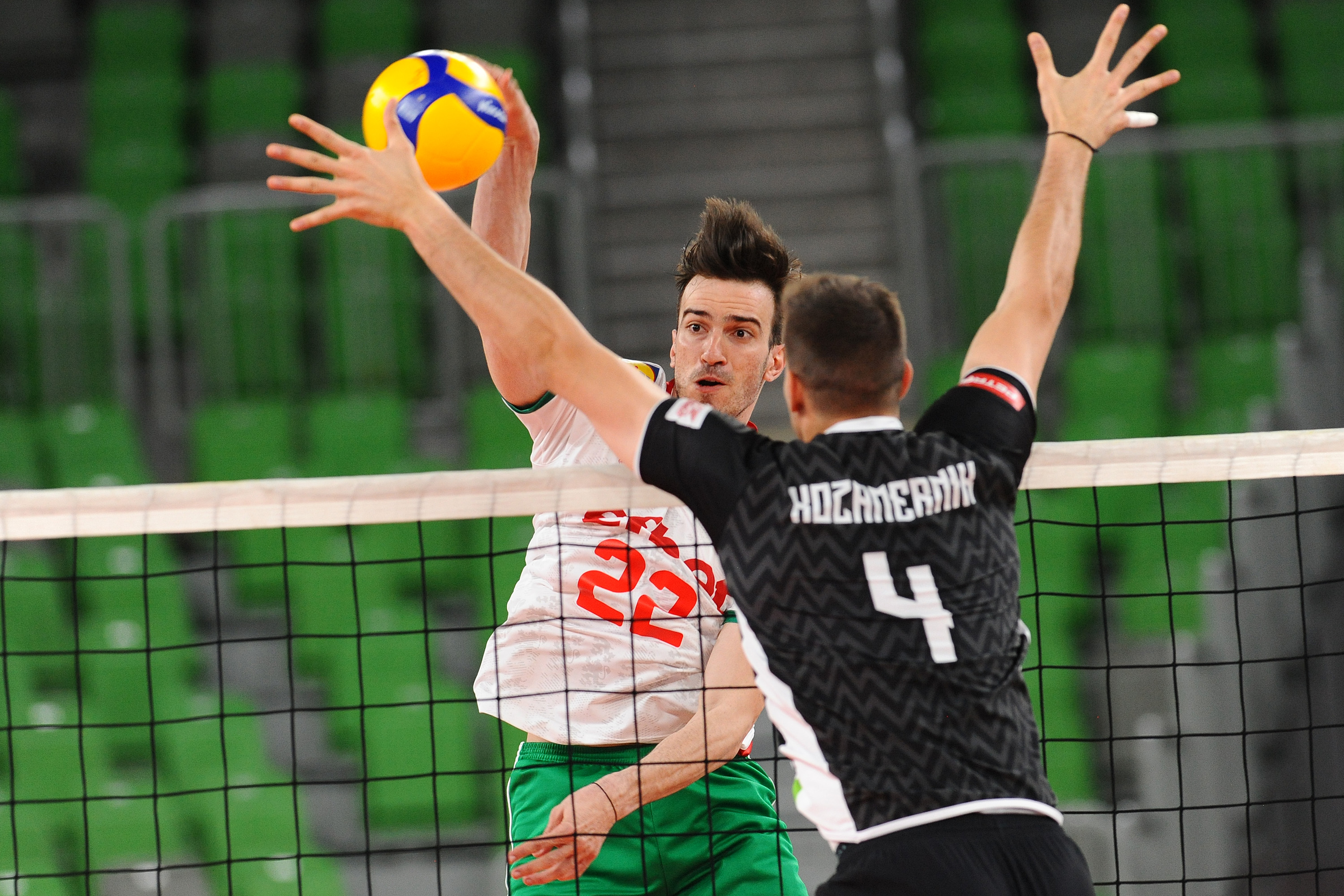 V Areni Stožice smo spremljali izenačen začetek turnirja, ekipi sta izmenično dosegali točke in bili poravnani na 4:4. Na začetni udarec Sokolova so gostje prišli do treh zaporednih točk ter slovenskega selektorja Alberta Giulianija prisilili v odmor. Po njem so Bolgari grešili, točki Tončka Šterna in Štalekarja v napadu pa sta Sloveniji zagotovili izenačenje na 10:10. Čebulj je Slovenijo povedel v vodstvo s 13:12. Sledil je nov preobrat, Seganov je izkoristil nezbranost naših za točko za 17:15. Bolgari so ostajali v ospredju in v končnico vstopili z minimalno prednostjo (20:19) ter po napaki naših v napadu vodili z 22:20. Po novem izenačenju, tokrat na 22:22, sta sledili še dve zaporedni napaki Slovencev, Giuliani je vzel odmor. Pajenk je izničil prvo zaključno žogo, Sokolov pa je zatem zaključil napad za zmago s 25:23.