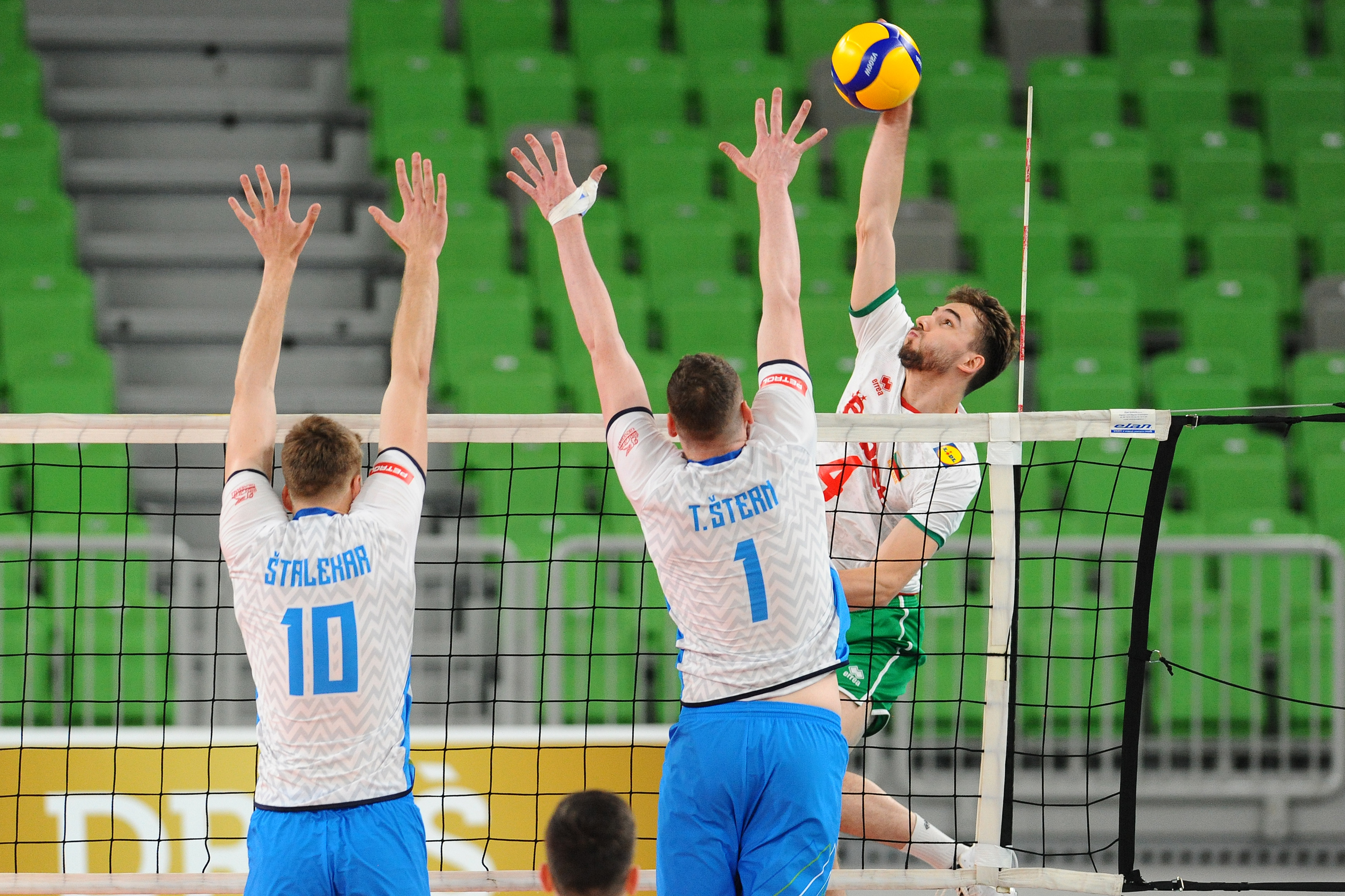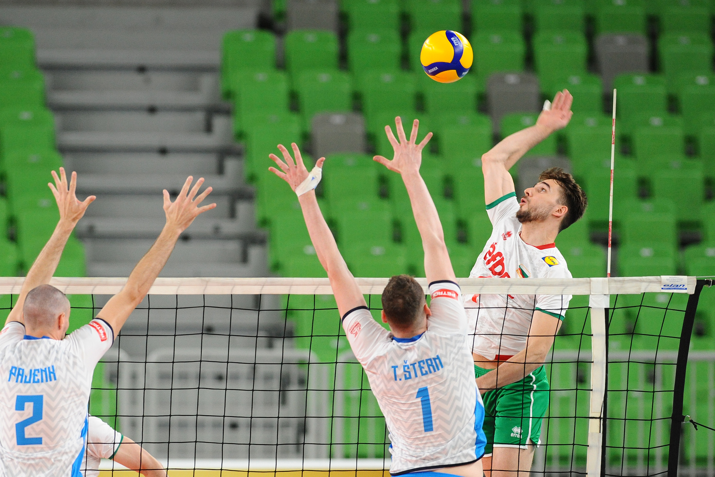 Na drugi tekmi dneva je slovenski selektor Alberto Giuliani v igro poslal Dejana Vinčića, Tončka Šterna, Žigo Šterna, Roka Možiča, Alena Pajenka, Saša Štalekarja in Jana Klobučarja. Po izenačenem začetku so Slovenci na začetni udarec Štalekarja ter s prodorno igro Tončka Šterna in Pajenka povedli z 10:7. Sledile so napake na začetnem udarcu, ki so Bolgarom omogočile, da so ujeli priključek. Žiga Štern je z napadi še ohranjal našo vrsto v ospredju, Stefan Čavdarov je zatem prispeval as za prvo vodstvo z 19:18. Žiga Štern je bil prodoren v napadih in je tudi poskrbel za zaključno žogo pri 24:23, Seganov je z blokom ustavil Možiča. Giuliani je vzel odmor, a je tekmecem uspel napad za zmago s 26:24.