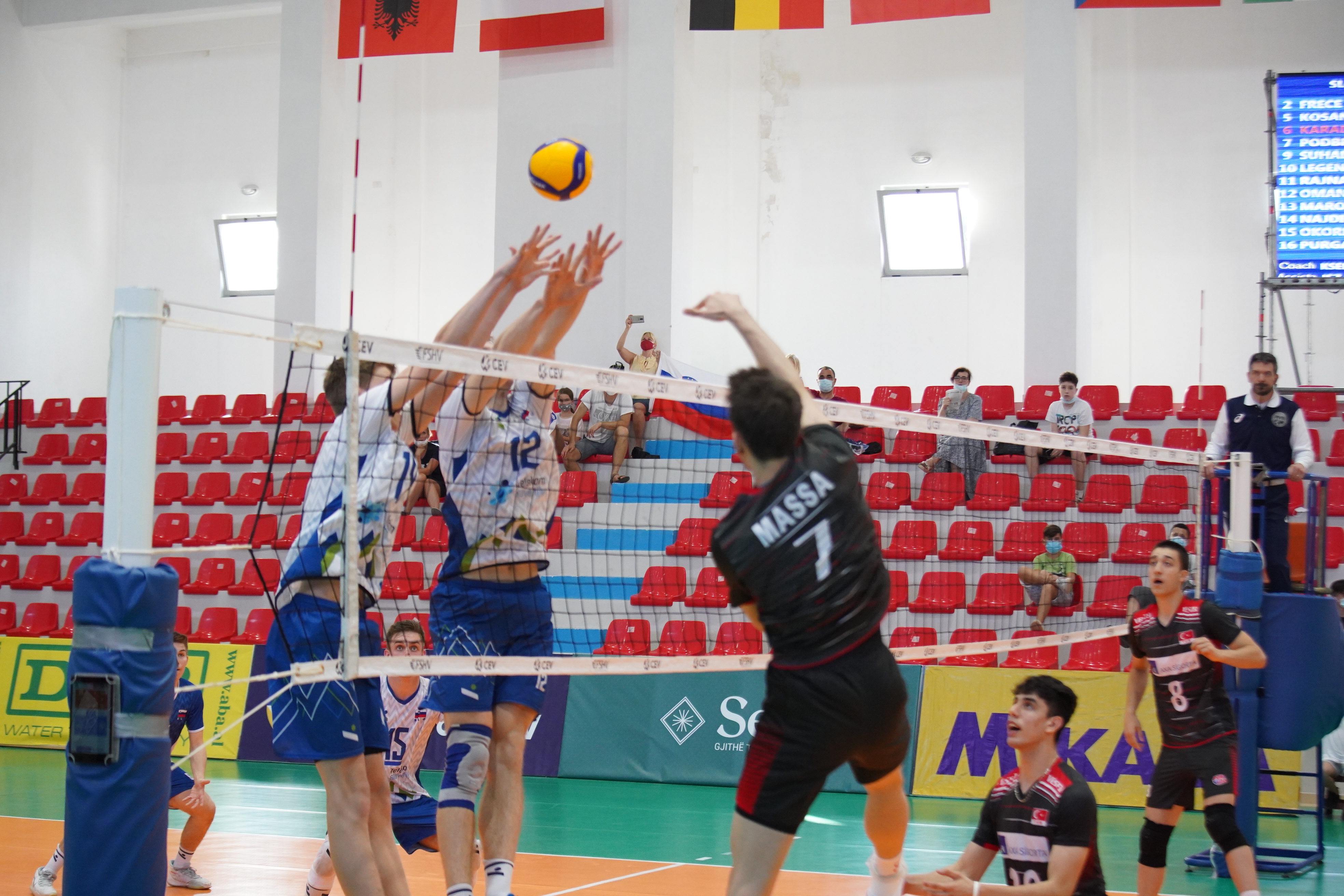 Prvi točki druge tekme evropskega prvenstva v Tirani med Slovenijo in Turčijo sta pripadli našim odbojkarjem, sledil je preobrat, po zaslugi Dogana Karakoca je Turčija povedla z 8:5 ter prednost ohranjala tudi v nadaljevanju (12:9). Po dobrih začetnih udarcih Nejca Najdiča se je naša vrsta približala na 11:12. Miha Okorn z dobrimi servisi in Luka Marovt s protinapadom sta Slovenijo popeljala v vodstvo s 15:13. Naši so pri 17:14 prvič vodili s tremi točkami naskoka, a so se tekmeci vrnili v igro in izid na 18. točki poravnali. Slovenci so ostali zbrani, na začetni udarec Marovta so prek Jurija Omana spet ušli na 22:19, niz je pri 25:22 zaključil Podbregar Špes.