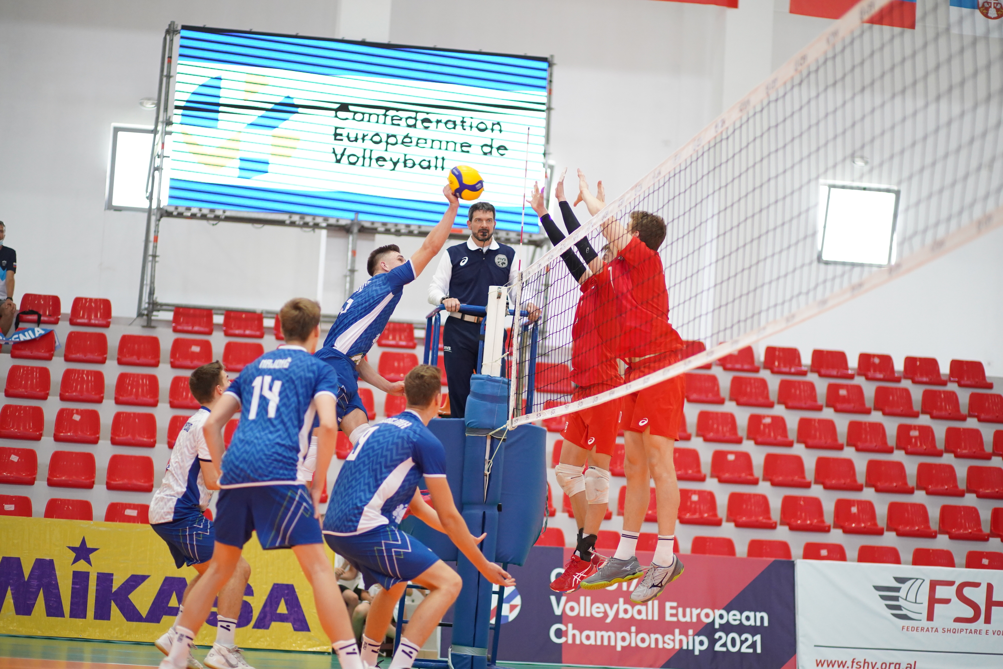 Po izenačenem začetku četrte tekme skupinskega dela prvenstva do 17 let v Albaniji, ko sta izbrani vrsti Slovenije in Rusije izmenično nizali točke in se vse do 10:10 tudi izmenjevali v vodstvu, so za dve točki po uspešnem napadu Mihe Okrona prvi pobegnili naši odbojkarji (12:10). Po neuspešnih zaključkih naših je sledil preobrat, v ospredje so prešli Rusi in povedli s 15:13 ter dve točki naskoka ohranjali vse do končnice, ko so si prek Kvočka priigrali vodstvo z 20:17. V nadaljevanju je za točke skrbel Skvortsov ter svoje moštvo pripeljal do zmage s 25:19.