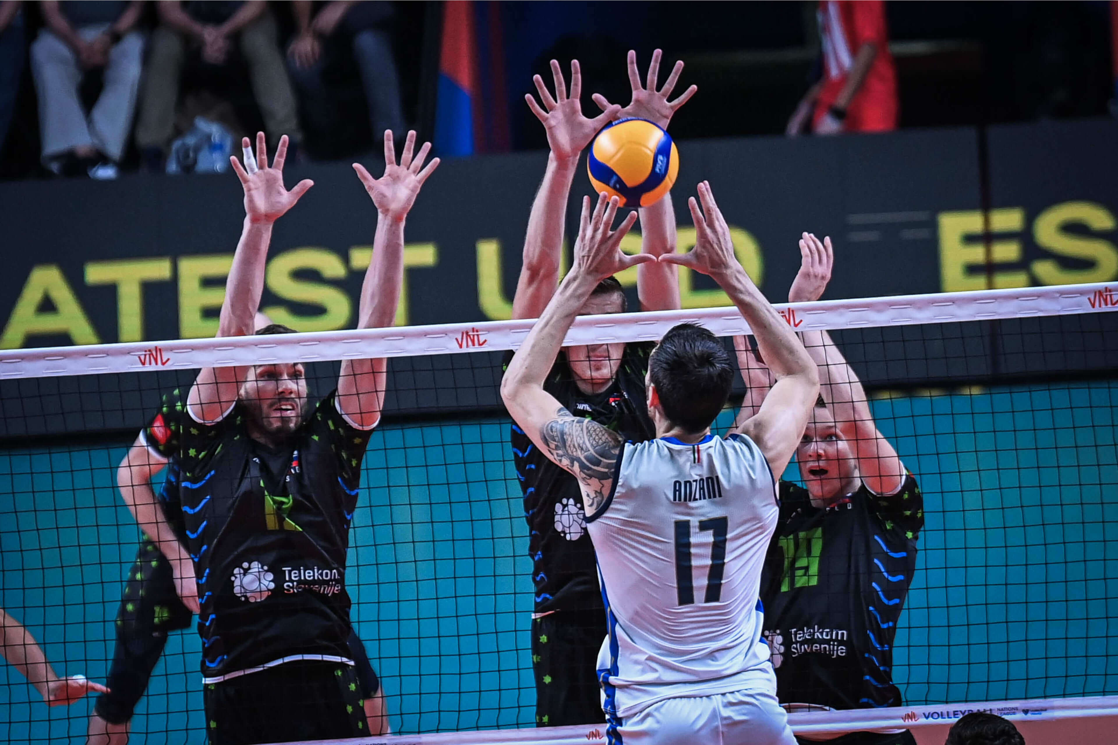 Slovenski selektor Mark Lebedew je na današnji tekmi proti aktualnim evropskim prvakom Italijanom že lahko računal na vseh 14 odbojkarjev, torej tudi na Janija Kovačiča in Tončka Šterna, ki sta se v ekipo vrnila po bolezni. A obračun so začeli Dejan Vinčić, ki je bil na mestu podajalca prvič v letošnji VNL v udarni postavi, priložnost je dobil Jan Klobučar kot korektor, Žiga Štern in Rok Možič kot sprejemalca, prvič smo na igrišču lahko spremljali še Saša Štalekarja, ob njem je kot srednji bloker igral Jan Kozamernik, prosti igralec je bil Alan Košenina.
