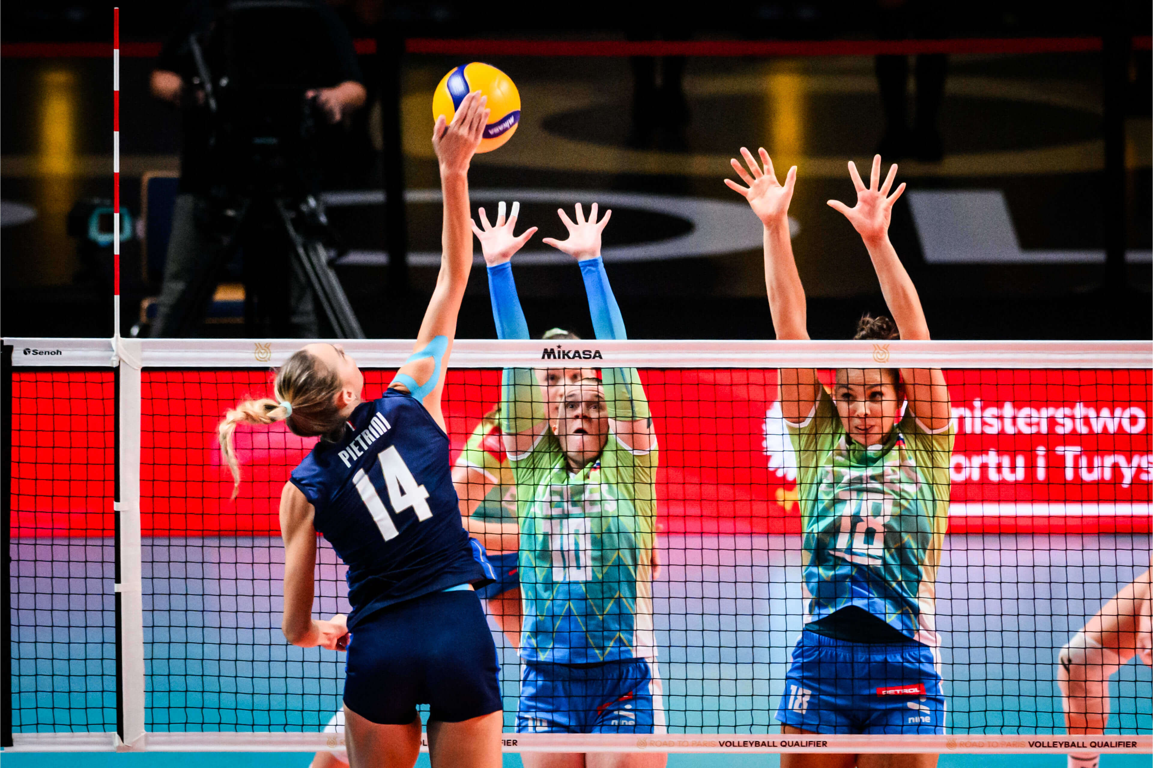 Slovenske odbojkarice so kvalifikacije za olimpijske igre v Parizu, ki jih gosti Lodž, začele s porazom proti gostiteljici Poljski, tretjeuvrščeni ekipi iz letošnje elitne lige narodov. Naših deklet nič lažja naloga ni čakala na drugi tekmi, na kateri so se pomerile z eno najboljših ekip na svetu v zadnjih letih, Italijo. Slovenski strateg Marco Bonitta ni spreminjal svoje začetne zasedbe in je tudi tokrat na igrišče poslal podajalko Saro Najdič, korektorico Evo Zatković, sprejemalki Loreno Lorber Fijok in Mašo Pucelj, srednji blokerki Sašo Planinšec in Mirto Velikonja Grbac ter prosto igralko Anjo Mazej.