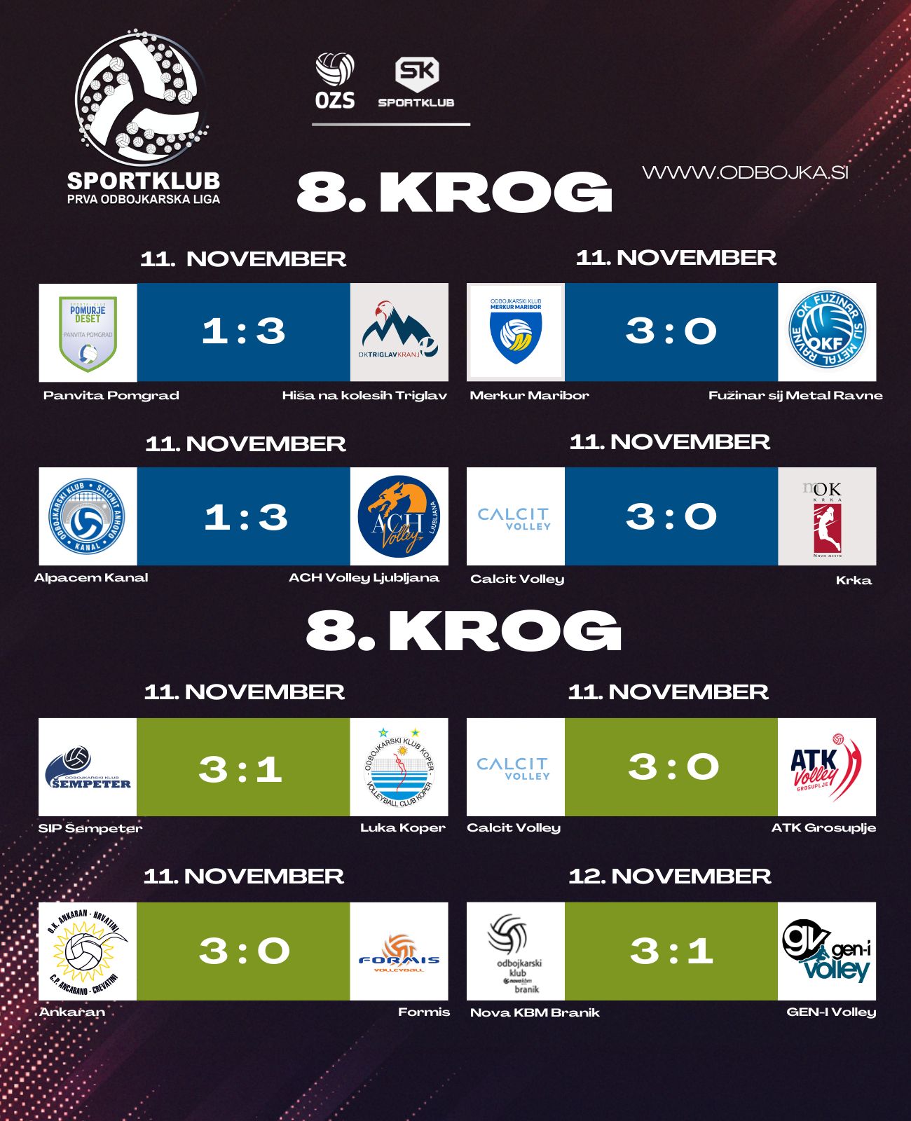 V osmem krogu Sportklub 1A. DOL za moške je Panvita Pomgrad doma izgubila z 1:3 (16, -23, -21,-18) proti ekipi Hiša na kolesih Triglav. Tekma se je začela s 15-minutno zamudo, saj so gostje zaradi prometnih zastojev na tekmo prišli tik pred zdajci. To jih sicer ni zmedlo, saj so na tekmi celo prešli v vodstvo, a so domačini po izenačenju na 5:5 nato hitro povedli. Ekipi sta bili precej izenačeni, po točkah Jovovića in Perunčića je bilo 15:13, domači trener Fujs pa je z odmorom zelo uspešno prekinil gorenjski niz. Ko je na servis prišel Vid Suhadolnik, se je domačim začela nasmihati zanesljiva zmaga v prvem nizu, saj je tam ostal do izida 23:13. Končni rezultat 25:16 pa je z uspešnim napadom domačih postavil Urban Drvarič. Tudi v drugem nizu so bolje začeli Kranjčani, a so domači igralci kmalu izenači in tudi prišli do minimalnega vodstva. Gostje so izenačili na 17. točki, z zavzeto igro pa niz dobili s 23:25. V tretjem nizu so do prvega vodstva prišli odbojkarji Panvite Pomgrad, gostje pa so izenačili na 6:6 in nato prešli v vodstvo. Do izida 12:13 je bil niz precej izenačen, v nadaljevanju pa so si gostje priigrali občutnejšo prednost. Kljub napadom domačih, je bila ta dovolj visoka, da so Gorenjci niz dobili z 21:25. Tudi v četrtem nizu so bolje začeli odbojkarji Hiše na kolesih Triglava, ki so povedli za tri točke, a so jih domačini ujeli na 11. točki. V nadaljevanju so ili znova podjetnejši gostje, še posebej, ko je na servis prišel Jovović in ekipo popeljal do vodstva s šestimi točkami (14:16). Jovović je tudi postavil končni rezultat tekme 18:25.