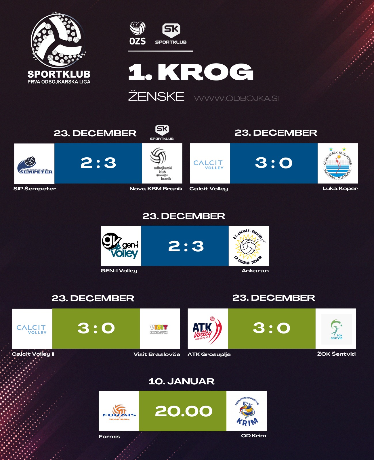V zeleni skupini so v prvem krogu odbojkarice Calcit Volleyja II s 3:0 premagale Visit Braslovče, ATK Grosuplje je bil doma s 3:0 boljši od ŽOK Šentvid, tekma med Formisom in OD Krim pa bo na sporedu 10. januarja 2024.