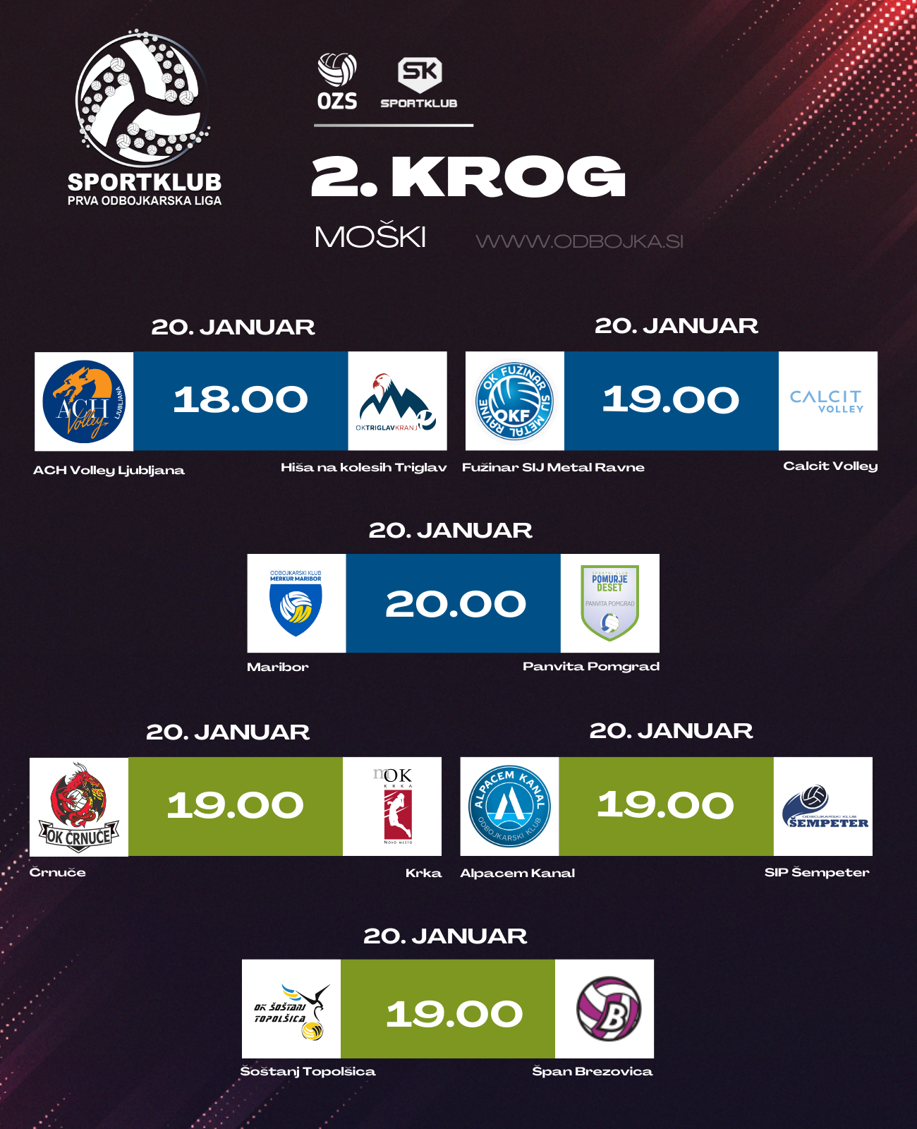 Odbojkarje čaka drugi krog drugega dela Sportklub prve lige. V derbiju kroga bodo odbojkarji ACH Volleyja v Ljubljani gostili ekipo Hiša na kolesih Triglav. Tekma v Tivoliju se bo začela ob 18. uri. Ob 19. uri se bo začelo srečanje med Fužinarjem SIJ Metalom Ravne, ki se bo poskušal zoperstaviti kamniškemu Calcit Volleyju, ki je pred sobotnim obračunom na vrhu lestvice z 41 točkami izenačen z ljubljanskim ACH Volleyjem. Ob 20. uri pa se bo začela še tekma med Mariborom in Panvito Pomgradom.