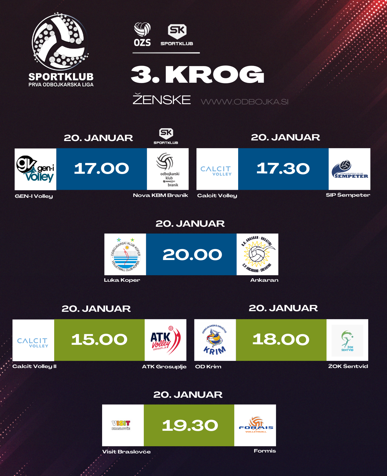 Kot prve bodo v tekmovalno soboto vstopile odbojkarice GEN-I Volleyja in Nove KBM Branik, ki se bodo v Novi Gorici v tretjem krogu drugega dela prvenstva borile za nove točke v modri skupini. Srečanje med Mariborčankami, ki so trenutno v državnem prvenstvu druge, in Novogoričankami, ki so na lestvici četrte, si boste lahko ogledali v neposrednem prenosu na Sportklubu. Pol ure kasneje, ob 17.30, se bo začela tekma med Calcit Volleyjem in SIP Šempetrom, prvo- in tretjeuvrščeno ekipo prvenstva. Ob 20. uri sledi še primorski derbi med Luko Koper in Ankaranom.
