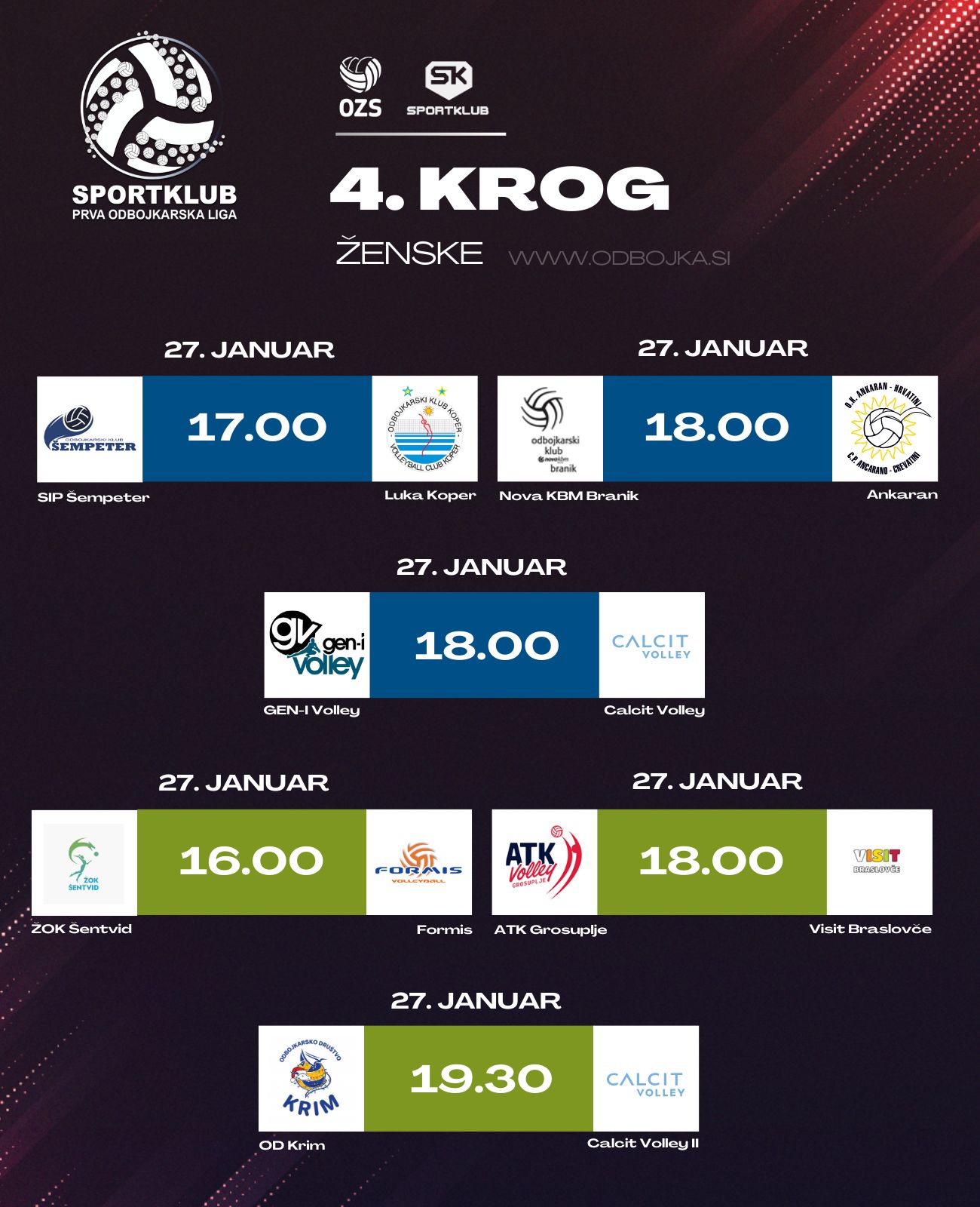 Sportklub prva odbojkarska liga je v polnem zamahu in ta konec tedna so na sporedu nove tekme v modri in zeleni skupini. Odbojkarice bodo vse tekme 4. kroga v modri in zeleni skupini odigrale v soboto. V modri skupini bodo prve na parket stopile igralke SIP Šempetra in Luke Koper, ki bodo s tekmo začele ob 17. uri. Ob 18. uri pa se bosta začeli še tekmi med Novo KBM Branik in Ankaranom ter GEN-I Volleyjem in Calcit Volleyjem. V zeleni skupini bo ŽOK Šentvid ob 16. uri gostil Formis, ob 18. uri se bosta srečala ATK Grosuplje in Visit Braslovče, ob 19.30 pa še OD Krim in Calcit Volley II. V 1B. ligi v rdeči skupini so odbojkarice Mozirja in Murexina Puconci tekmo kroga že odigrale in se razšle z rezultatom 3:0, v petek pa je na sporedu tekma med Prevaljami in ŽOK Ljutomer.