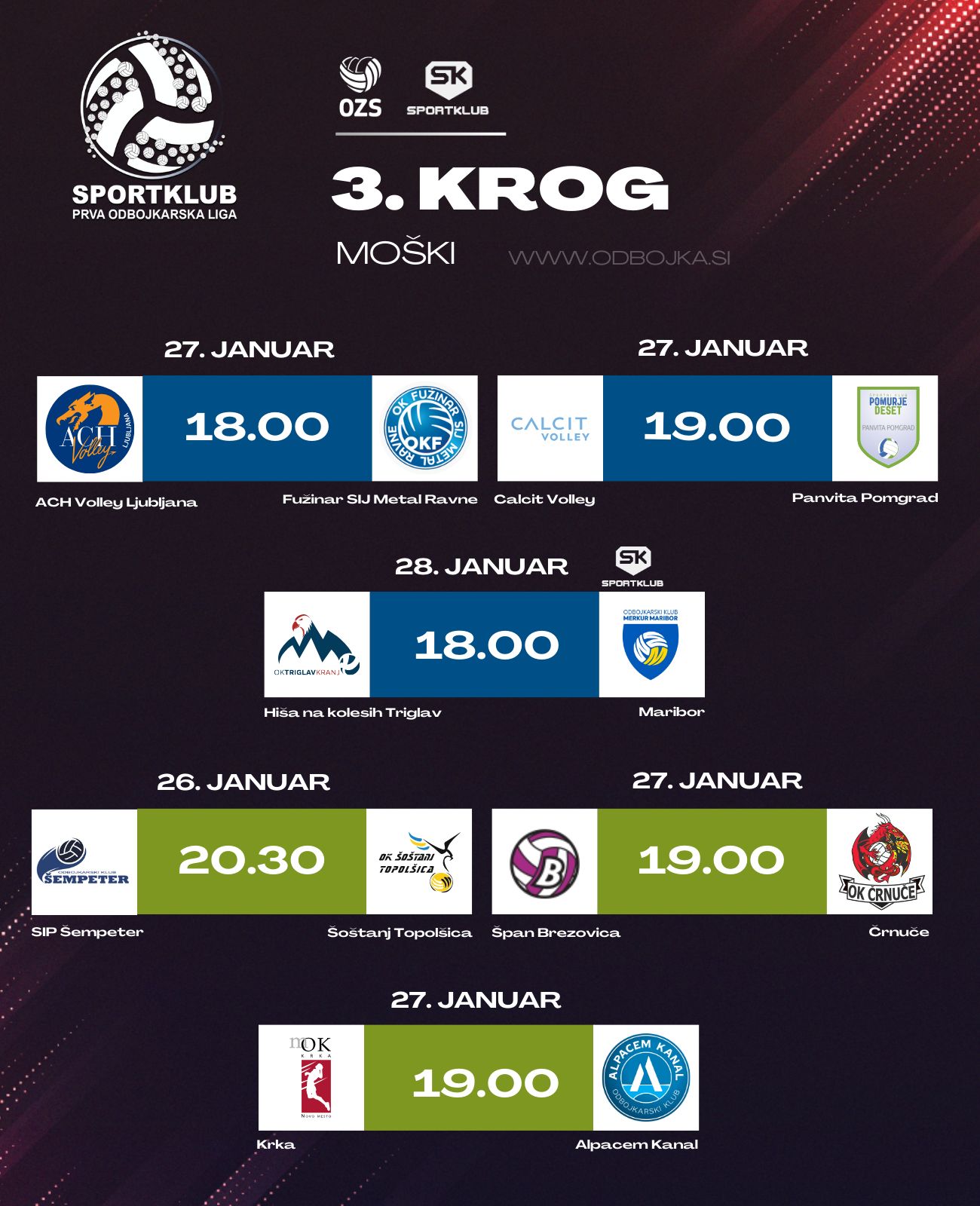 Moški bodo v Sportklub prvi odbojkarski ligi ta konec tedna igrali tekme 3. kroga. V soboto ob 18. uri bo ljubljanski ACH Volley v modri skupini gostil koroško ekipo Fužinar Sij Metal Ravne, ob 19. Uri pa bo na sporedu še tekma med Calcit Volleyjem in Panvito Pomgrad. Tekma med Hišo na kolesih Triglav in Mariborom bo na sporedu v nedeljo (ob 18. uri), ogledali pa si jo boste lahko tudi na Sportklubu. Tudi v zeleni skupini bodo ekipe igrale tekme tretjega kroga. V petek ob 20.30 bo SIP Šempeter doma lovil nove točke proti ekipi Šoštanja Topolšice, v soboto pa sledita še srečanji med Španom Brezovico in Črnučami (19.00) ter Krko in ekipo Alpacem Kanal (19.00). V 1B. ligi v rdeči skupini se bo OK Sava v soboto doma pomerila s Calcit Volleyjem II (16.30), Keko Oprema Žužemberk pa ob 19.00 z ATHOS-om Kostanjevico.