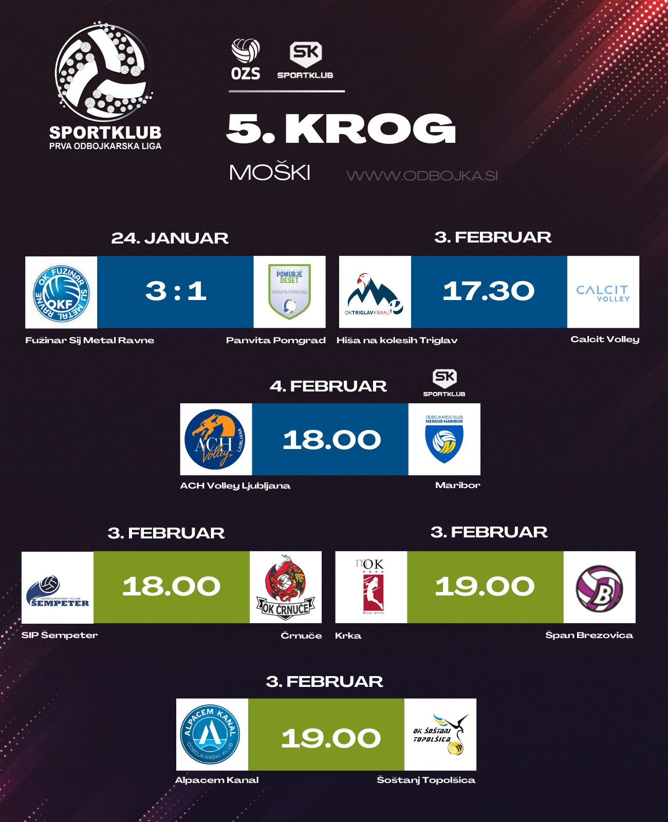 Prva tekma petega kroga modre skupine v Sportklub prvi ligi za moške je bila odigrana že 24. januarja. Fužinar Sij Metal Ravne je s 3:1 (-12, 19, 27, 15) premagal Panvito Pomgrad. V soboto se bosta ob 17.30 srečali ekipi Hiše na kolesih Triglav in Calcit Volleyja. Zadnja tekma kroga bo na sporedu v nedeljo, ko bo ljubljanski ACH Volley ob 18. uri gostil Maribor. Tekmo si boste lahko ogledali na Sportklubu.