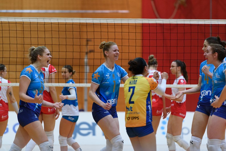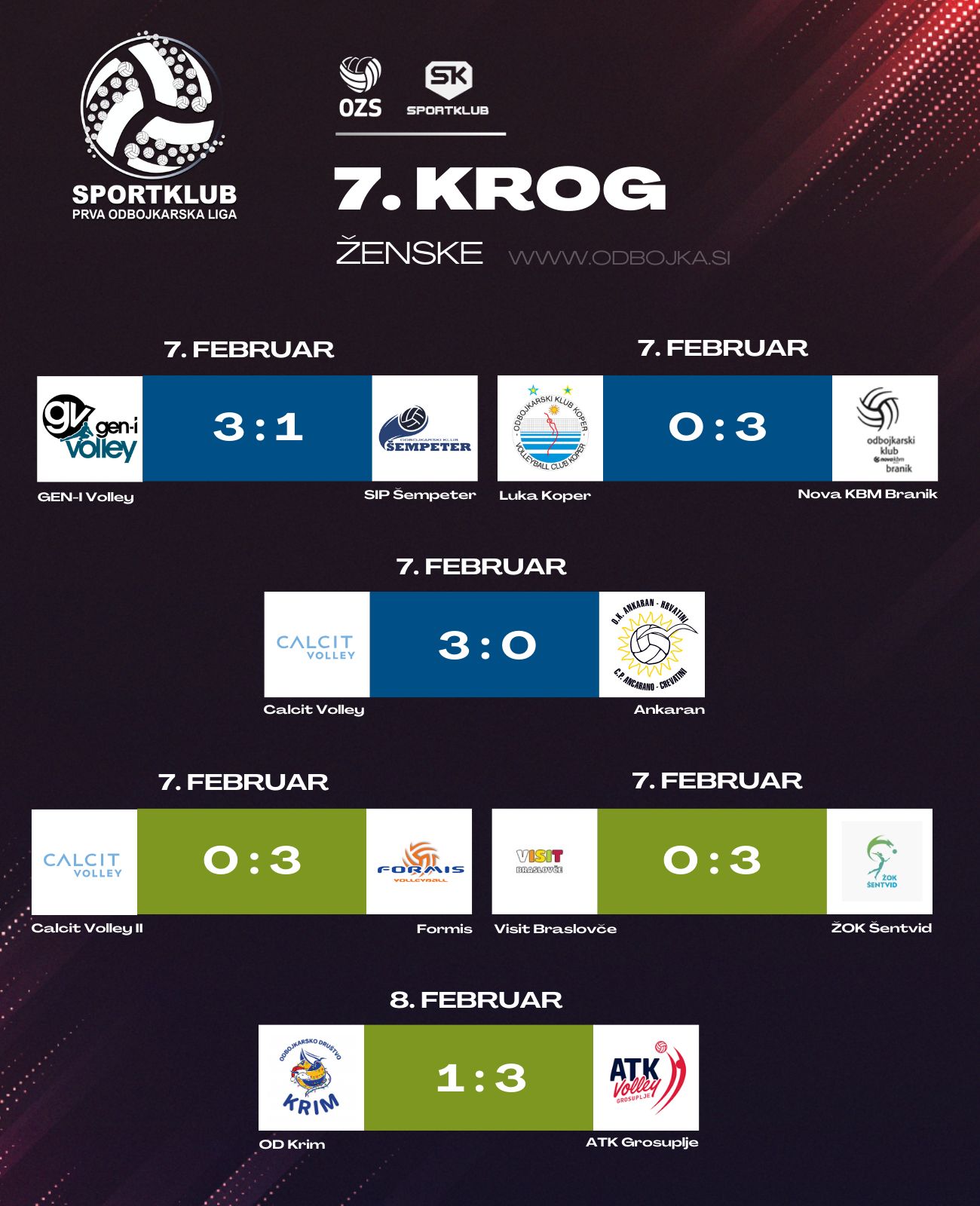 Kot prve so na parket v sedmem krogu Sportklub prve odbojkarske lige za ženske v modri skupini stopile odbojkarice GEN-I Volleyja in SIP Šempetra. Srečanje v Novi Gorici se je končalo po štirih nizih z zmago domačink, ki so slavile s 3:1 (17, 22, -16, 18). Domačinke so v prvem nizu kmalu prišle do vodstva s štirimi točkami, a so se gostje uspele približati na 7:5. Novogoričanke niso prepustile preobrata, skozi celoten niz so bile v vodstvu, ki so ga še višale in niz brez težav dobile s 25:17. V drugem nizu smo spremljali precej bolj izenačen boj. Navkljub vodstvu GEN-I Volleyja z 11:7 so odbojkarice SIP Šempetra z vztrajnostjo prišle do izenačenja na 14. točki. Od tu dalje so bile znova podjetnejše domačinke, ki so uspele osvojiti tudi ta niz (25:22). V tretjem nizu so bolje začele Šempetranke in prišle do prvega vodstva, ki je skozi niz naraščalo (12:18, 12:20). Z odlično igro so gostje zaustavile vse poizkuse domačih odbojkaric, tako da ni bilo dvoma da bo tretji niz pripadel gostujoči ekipi (16:25). Tudi v četrtem nizu so močno začele Šempetranke in prišle do vodstva (1:4, 4:8, 7:11). Na enajsti točki so Novogoričanke uspele izenačiti, izid je bil poravnan še na 12:12, nato pa so domačinke stopile na plin in si priigrale lepo prednost ter brez težav osvojile niz (25:18).