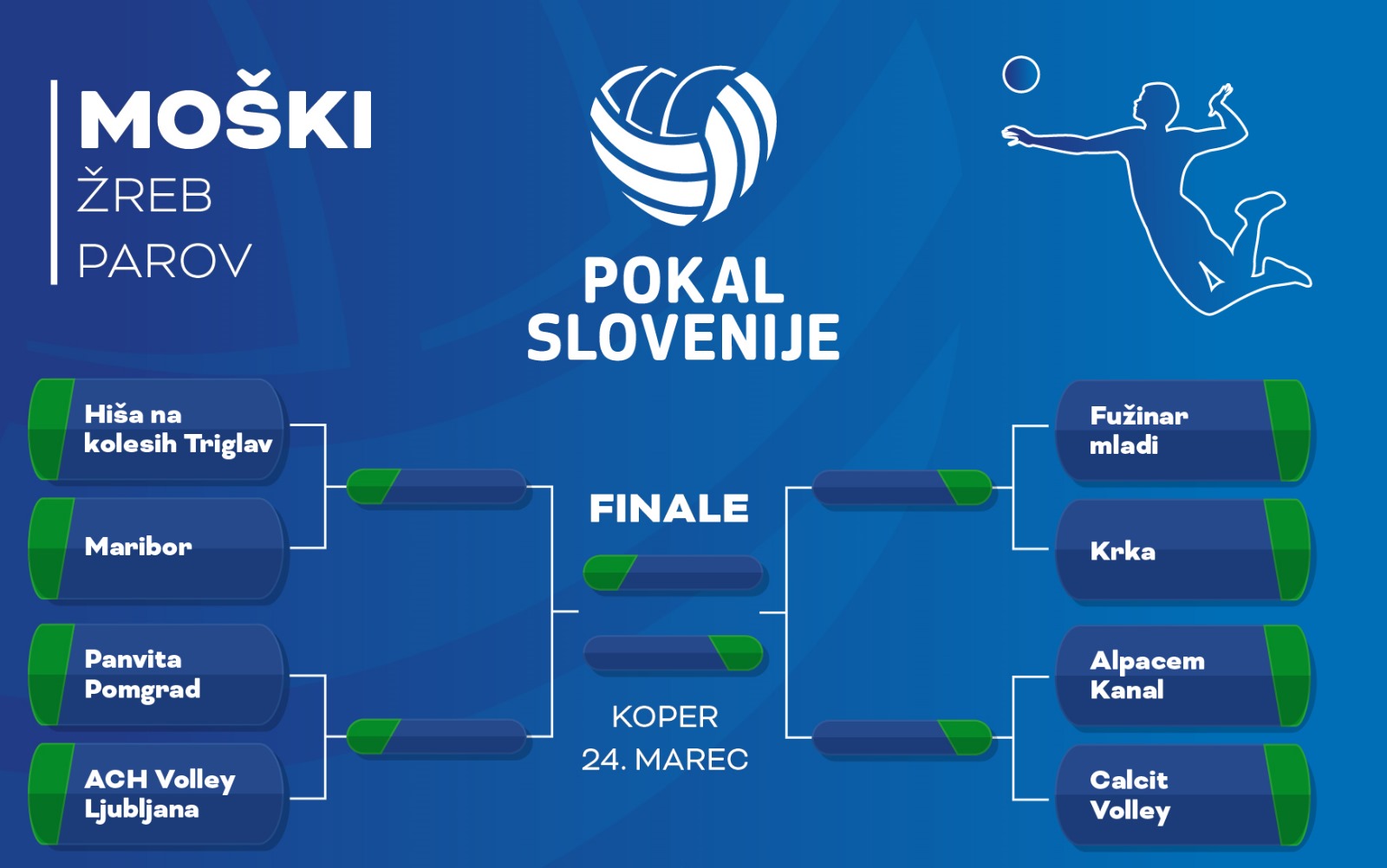 V Kranju, kjer bo Hiša na kolesih Triglav gostila Maribor, nas zagotovo čaka zanimiv obračun. Obe ekipi sta v zadnjih krogih slovenskega prvenstva namreč dokazali, da sta v dobri formi in lahko igrata na visoki ravni. Aktualne pokalne prvake, odbojkarje ACH Volleyja Ljubljana, čaka gostovanje pri vselej neugodni Panviti Pomgrad, mlada ekipa Fužinarja, ki je v osmini finala pripravila presenečenje in slavila nad prvo klubsko zasedbo, pa bo pred domačimi navijači pričakala novomeško Krko. Calcit Volley, ki si je po prvenstveni zmagi nad ACH Volleyjem Ljubljana privoščil zaporedna poraza proti Hiši na kolesih Triglav in Mariboru, pa si bo polfinale skušal priigrati v gosteh pri Alpacem Kanalu.