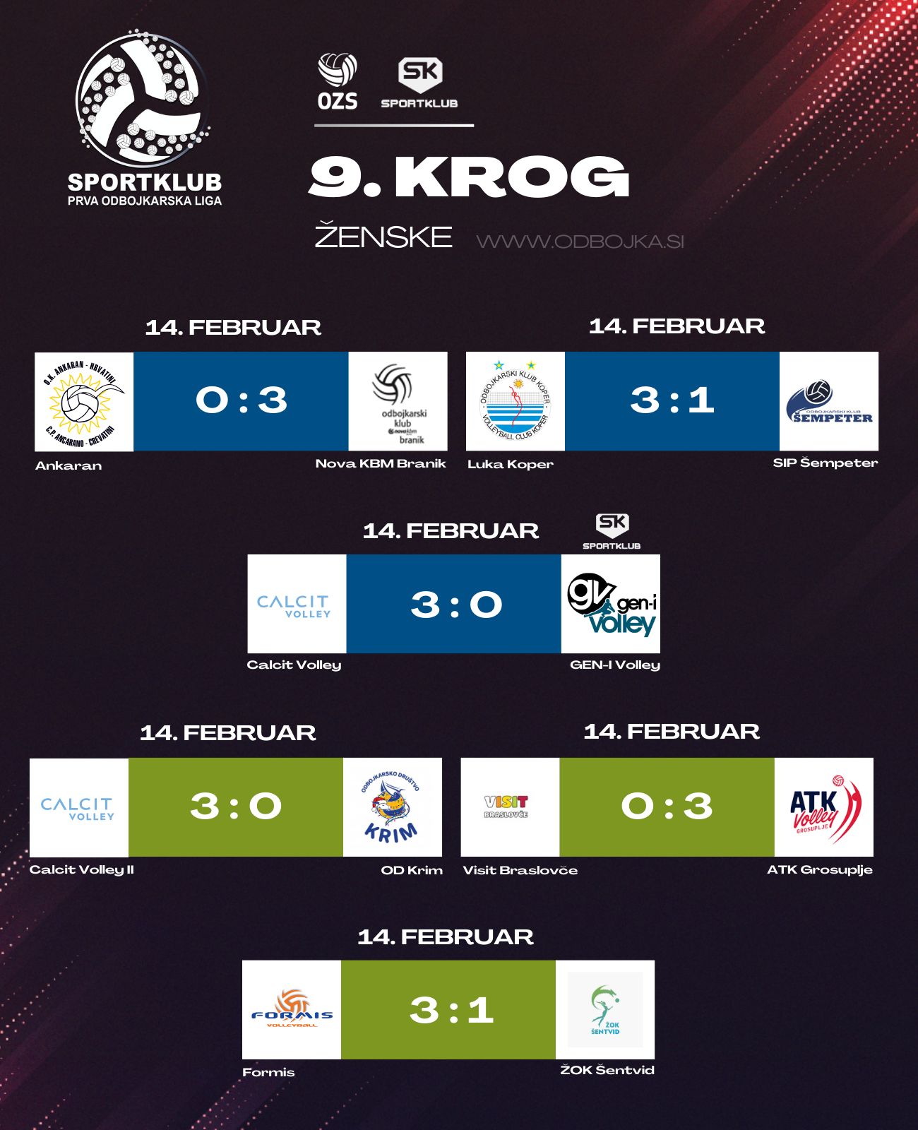 Brez večjih presenečenj je bilo v zeleni skupini, saj so vodilne tri ekipe lestvice dosegle zmage. Odbojkarice ATK Grosuplja so tokrat na gostovanju še podaljšale slab niz ekipe Visit Braslovče, ki v drugem delu državnega prvenstva še čaka na prvo zmago. Po devetih krogih so Braslovčanke namreč še brez točk. Tokrat so Grosupeljčanke slavile v treh nizih (0:3). Prvi se je končal z izidom 17:25, drugi z 8:25, tretji pa z 20:25. Formis je doma s 3:1 premagal ŽOK Šentvid. V prvem nizu so Hočanke sicer dosegle le 15 točk, vendar pa so v nadaljevanju srečanja pokazale veliko boljšo igro ter dobile naslednje tri nize s 25:19, 25:16 in 25:21. Do zmage v treh nizih pa so prišle odbojkarice Calcit Volleyja II, ki so doma s 3:0 (21, 20, 15) premagale ekipo OD Krim.