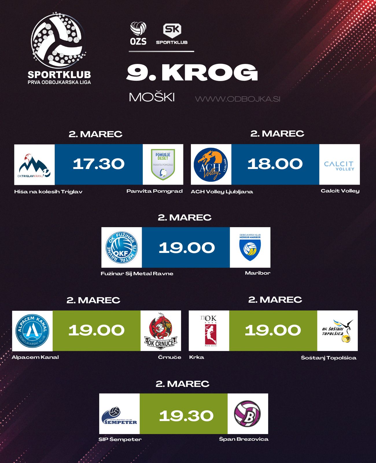 V Sportklub prvi odbojkarski ligi za moške bodo v soboto odigrane tekme 9. kroga drugega dela prvenstva. V modri skupini bodo prvi na igrišče stopili odbojkarji Hiše na kolesih Triglav in Panvite Pomgrad, tekma v Kranju se bo začela ob 17.30. Ob 18. uri bo sledil derbi kroga med vodilnima ekipama prvenstva ACH Volleyjem Ljubljana in Calcit Volleyjem. Ljubljančani po doslej odigranih tekmah prvenstva vodijo točko pred Kamničani. Ob 19. uri se bo začela še tekma med Fužinarjem Sijem Metalom Ravne in Mariborom.