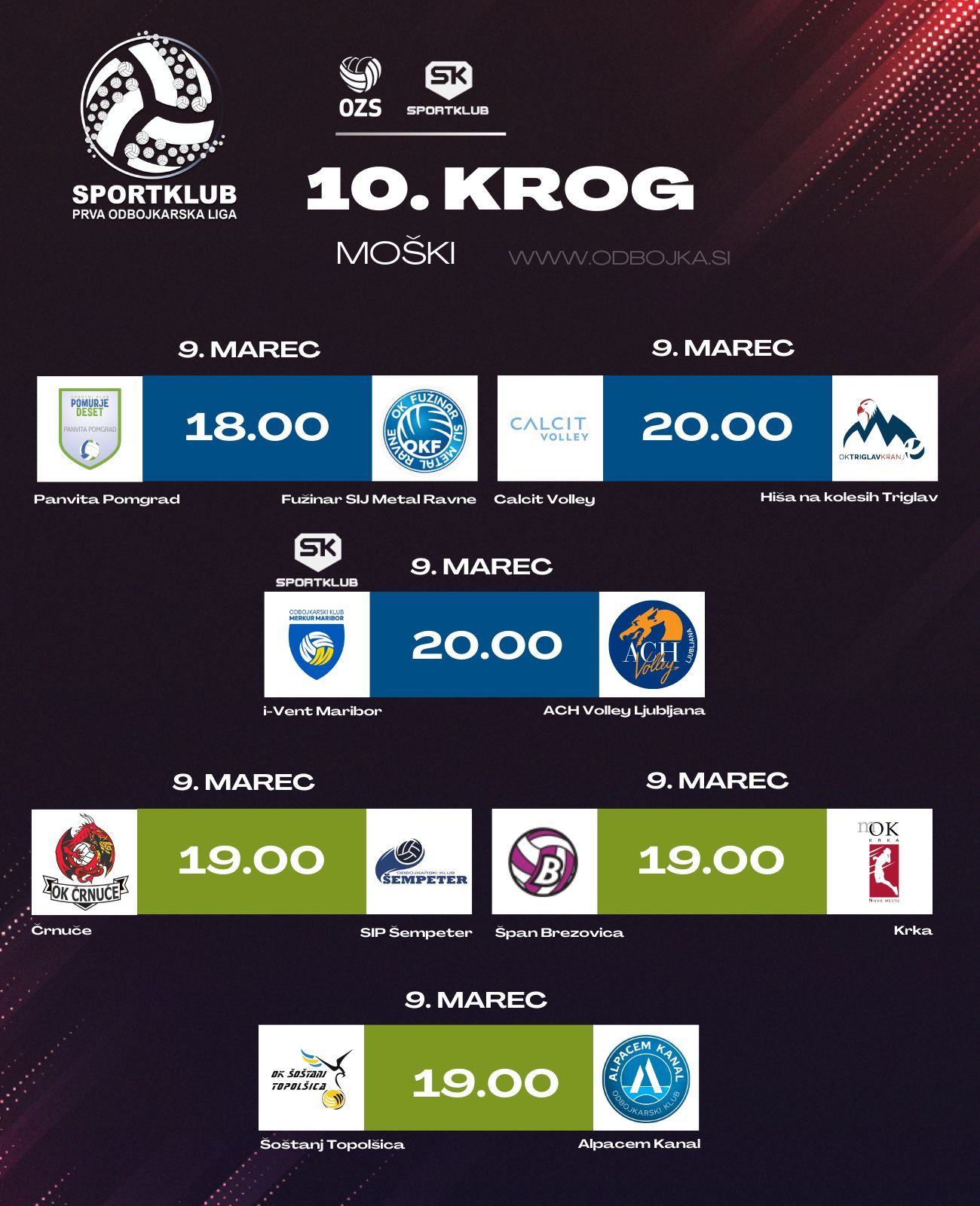 Ta teden smo dobili finalista Pokala Slovenije za moške, v soboto pa sledi še zadnji, 10. krog, modre in zelene skupine v Sportklub prvi odbojkarski ligi za moške. Še drugič v tem tednu se bosta pomerila i-Vent Maribor in ACH Volley Ljubljana. V polfinalu Pokala Slovenije so se zmage po treh nizih veselili Mariborčani in se uvrstili v finale, kjer se bodo srečali s Calcit Volleyjem. Tudi tokrat bodo Štajerci ljubljansko zasedbo gostili na domačem terenu, in sicer v soboto ob 20. uri. Prenos derbija modre skupine bo tudi na Sportklubu.
