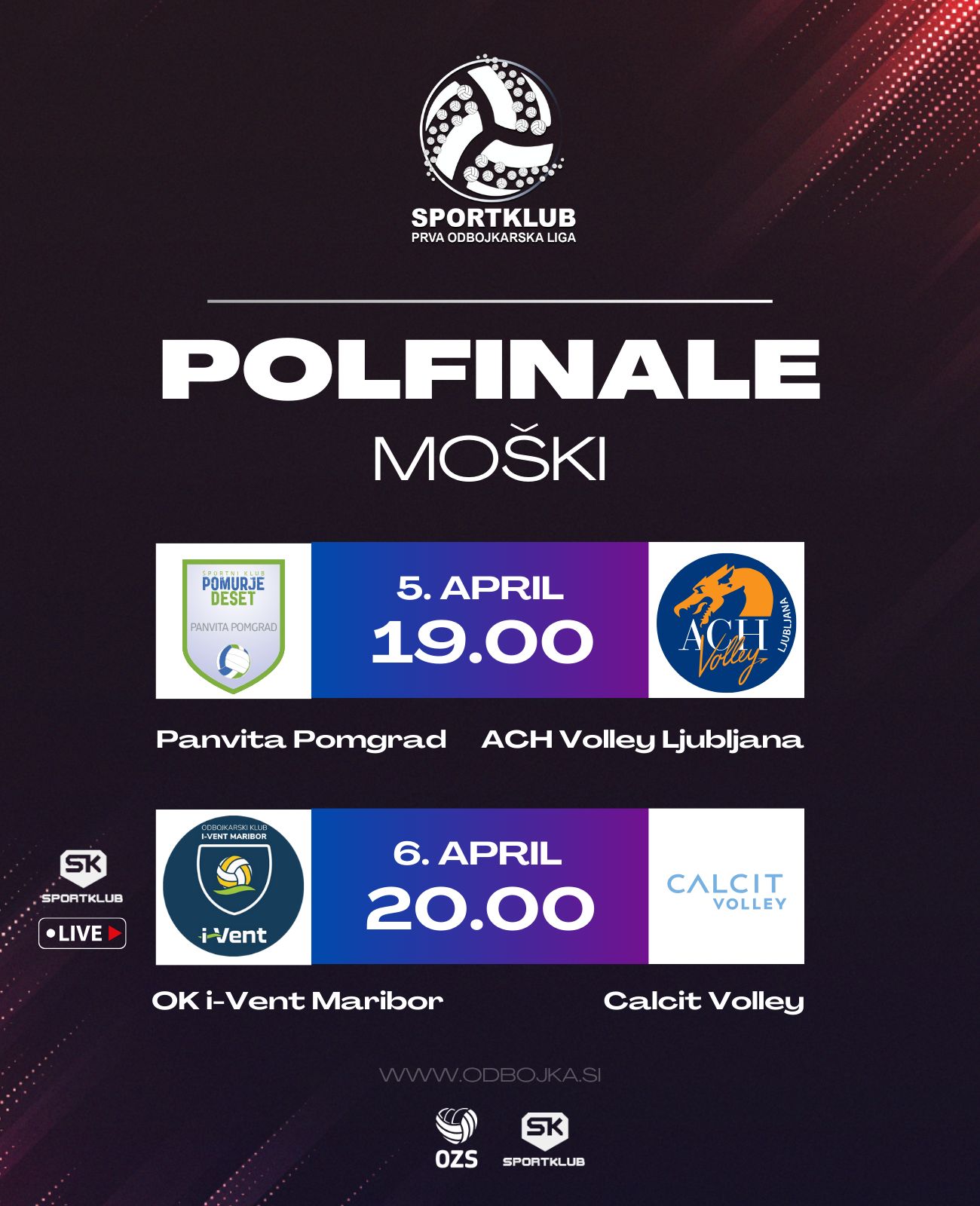 Ta petek in soboto sledijo povratne tekme. Ljubljančani bodo v petek ob 19. uri finale lovili pri Panviti Pomgrad, v soboto ob 20. uri pa sledi še polfinalno srečanje med OK i-Vent Maribor in Calcit Volleyjem. To tekmo si boste lahko ogledali v neposrednem prenosu na Sportklubu.