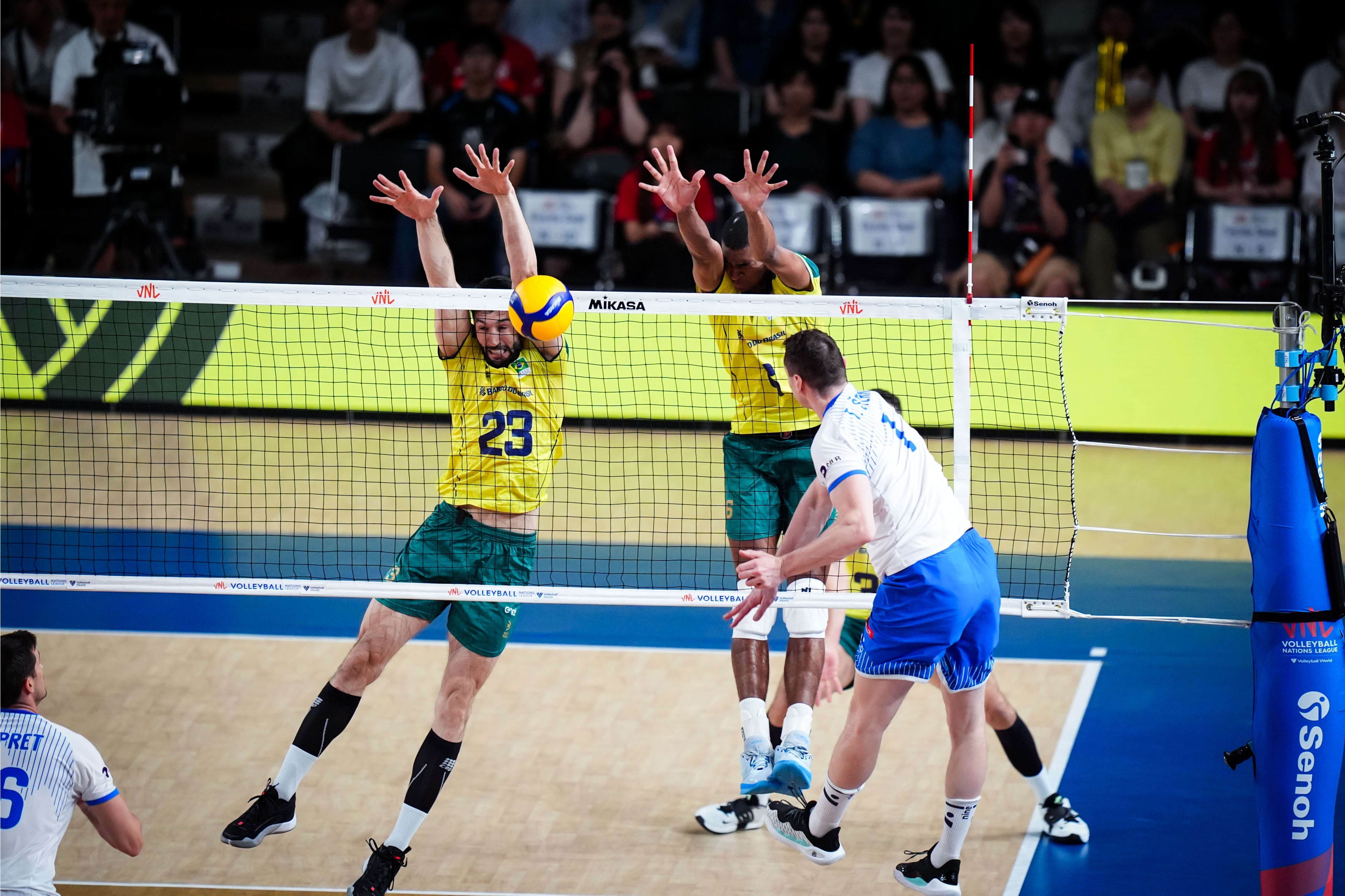 V Fukuoki, ki gosti drugi turnir Lige narodov, sta se med seboj pomerili trenutno peta reprezentanca sveta Brazilija in šesta Slovenija, ki je nastope na Japonskem sicer začela z zmago proti Turčiji, medtem ko so bili južnoameriški odbojkarji najprej uspešnejši od Nemcev, zatem pa še od Irancev. Na vseh dosedanjih medsebojnih obračunih so vselej slavili Brazilci, a so se jim naši fantje v lanski Ligi narodov zelo dobro upirali. Romunski strateg na slovenski klopi Gheorghe Cretu je dvoboj začel s svojo standardno zasedbo, s podajalcem Gregorjem Ropretom, korektorjem Tončkom Šternom, sprejemalcema Tinetom Urnautom in Klemnom Čebuljem, srednjima blokerjema Alenom Pajenkom in Janom Kozamernikom ter prostim igralcem Janijem Kovačičem.